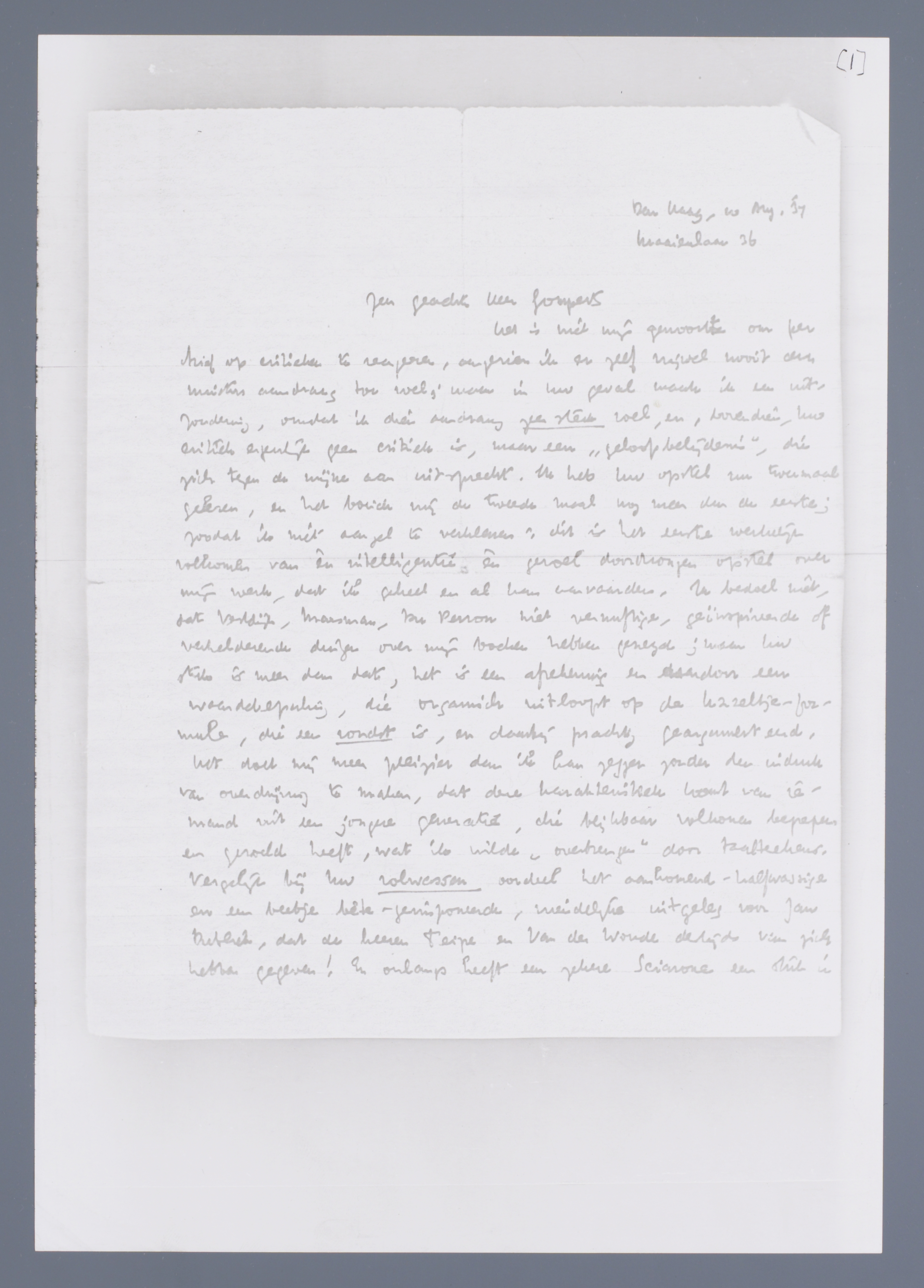 Het is niet mijn gewoonte om per brief op critieken te reageren, aangezien ik er zelf vrijwel nooit den minsten aandrang toe voel; maar in Uw geval maak ik een uitzondering, omdat ik dien aandrang zeer sterk voel, en, bovendien, Uw critiek eigenlijk geen critiek is, maar een ‘geloofsbelijdenis’, die zich tegen de mijne aan uitspreekt. Ik heb Uw opstel nu tweemaal gelezen, en het boeide mij de tweede maal nog meer dan den eerste; zoodat ik niet aarzel te verklaren: dit is het eerste werkelijk volkomen van èn intelligentie èn gevoel doorwrongen opstel over mijn werk, dat ik geheel en al kan aanvaarden. Ik bedoel niet, dat Vestdijk, Marsman, Du Perron niet vernuftige, geïnspireerde of verhelderende dingen over mijn boeken hebben gezegd; maar Uw stuk is meer dan dat, het is een afrekening en daardoor een waardebepaling, die organisch uitloopt op de Uzzeltje-formule, die een vondst is, en daarbij prachtig geargumenteerd, het doet mij meer pleizier dan ik kan zeggen zonder den indruk van overdrijving te maken, dat deze karakteristiek komt van iemand uit een jongere generatie, die blijkbaar volkomen begrepen en gevoeld heeft, wat ik wilde ‘overbrengen’ door taalteekens. Vergelijk bij Uw volwassen oordeel het aankomend-halfwassige en een beetje bête-[geponeerde], vriendelijke uitgeleg voor Jan Publiek, dat de heeren Teipe en Van der Woude destijds van zich hebben gegeven! En onlangs heeft een zekere Sciarone een stuk in Den Gulden Winckel geschreven, dat veel beter was, maar ook nog zoo braaf-adoreerend. Dat alles geeft iemand het misselijke vermoeden van in de toekomst even critiekloos tot autoriteit te zullen worden verklaard als nu door de Mij. der Ned. Letterk. te worden beschoolmeesterd; tusschen beide zaken is geen verschil. Ik zie aankomen, dat ik binnen vijf jaar verschillende oude standbeelden omver zal hebben gepraat, en dan zelf tot standbeeld zal worden verheven; op dat schouwspel verheug ik mij niet bepaald. Mijn werk heeft deze autorisatie achteraf niet noodig; het is alleen geschreven om ‘ontmoetingen’ uit te lokken, zooals die met U. Honderdmaal meer dan welke erkenning ook door autoriteiten en nutslezers is mij waard één zin van U: ‘hier heeft iemand... géén verraad aan zijn jeugd gepleegd’. Voor deze éénen zin geef ik weer minstens één jaar van misverstand, vechten tegen vele bierkaaien en vriendelijke schouderklopjes cadeau. Dat is een groote lof, die U mij daar ‘toezwaait’. Ik herinner mij nog, dat ik in mijn P.C.-tijd herhaaldelijk die desertie, waarvan U spreekt, heb waargenomen bij de generatie, die toen zoo oud was als ik nu, en soms benauwde mij het gevoel, dat dit deserteeren op een biologische onontkoombaarheid leek. Ik rilde, als ik eraan dacht, dat ook ik zulk een verrader zou moeten worden, blijkbaar. Uw verzekering is daarom voor mij niet alleen de kern van Uw artikel, maar ook de eenige ridderorde, die ik verlang.