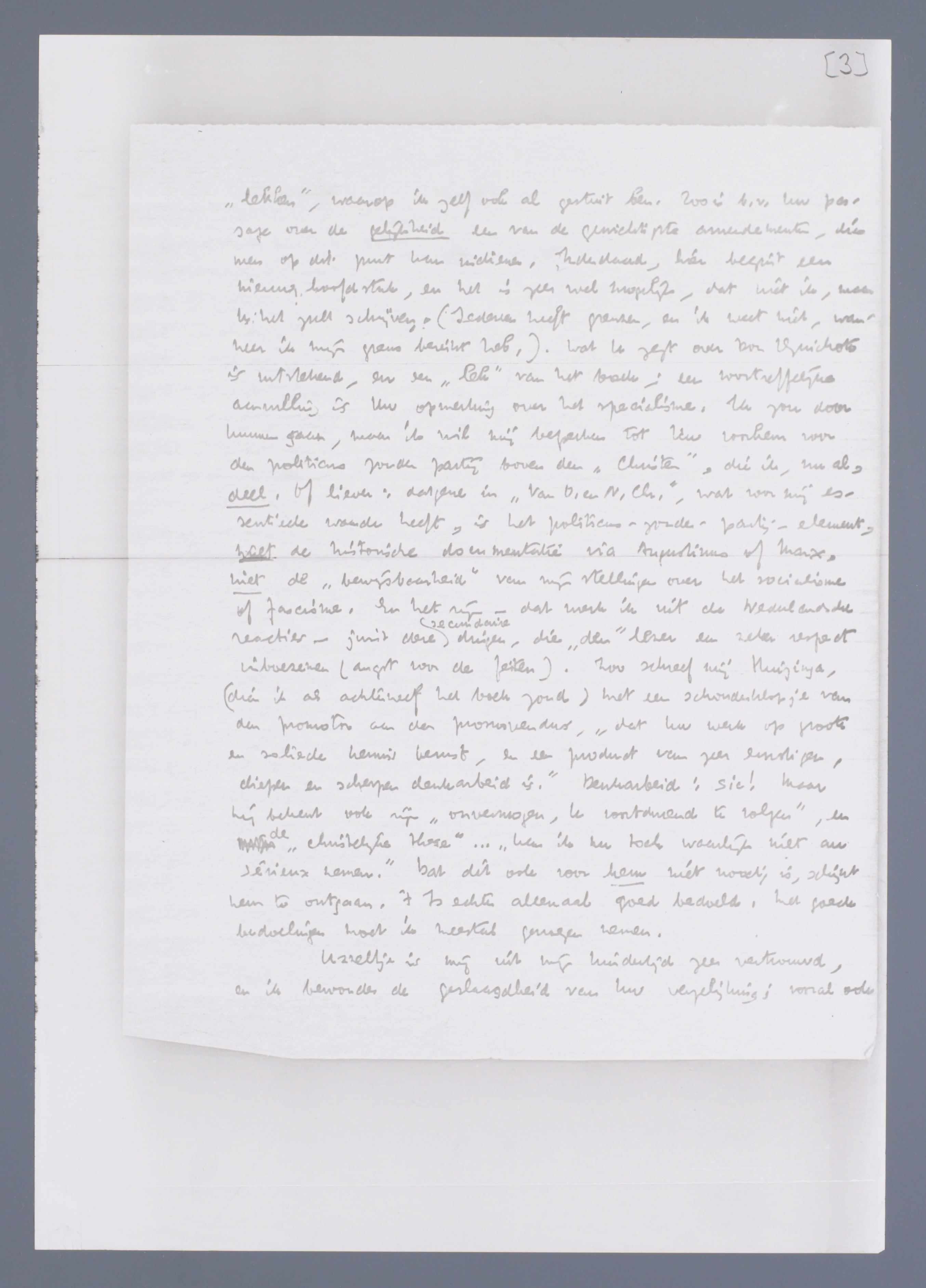 U hebt met zeldzame scherpzinnigheid het ‘rhythme’ van mijn ontwikkeling nagevoeld en in Uw text vast weten te houden. Het is vrijwel zonder uitzondering juist, wat er staat. Ik kan dat vooral verifieeren door de bezwaren, die U hier en daar oppert (de domheden tegen mijn domheden); het zijn de ‘lekken’, waarop ik zelf ook gestuit ben. Zoo is b.v. Uw passage over de gelijkheid een van de gewichtigste amendementen, die men op dit punt kan indienen. Inderdaad, hier begint een nieuw hoofdstuk, en het is zeer wel mogelijk, dat niet ik, maar U het zult schrijven. (Iedereen heeft grenzen, en ik weet niet, wanneer ik mijn grens bereikt heb,). Wat U zegt over Don Quichote is uitstekend, een ‘lek’ van het boek; een voortreffelijke aanvulling is Uw opmerking over het specialisme. Ik zou door kunnen gaan, maar ik wil mij beperken tot Uw voorkeur voor den politicus zonder partij boven den ‘Christus’, die ik, nu al, deel, of liever: datgene in ‘Van O. en N. Chr.’, wat voor mij essentieele waarde heeft, is het politicus-zonder-partij-element, niet de historische documentatie via Augustinus of Marx, niet de ‘bewijsbaarheid’ van mijn stellingen over het socialisme of fascisme. En het zijn - dat merk ik uit de Nederlandsche reacties - juist deze secundaire dingen, die ‘den’ lezer een zeker respect inboezemen (angst voor de feiten). Zoo schreef mij Huizinga, (dien ik als achterneef het boek zond) met een schouderklopje van den promotor aan den promovendus, ‘dat Uw werk op groote en soliede kennis berust, een product van zeer ernstigen, diepen en scherpen denkarbeid is’. Denkarbeid: Sic! Maar hij bekent ook zijn ‘onvermogen, U voortdurend te volgen’, en de ‘christelijke these’... ‘kan ik nu toch waarlijk niet au sérieux nemen’. Dat dit ook voor hem niet noodig is, schijnt hem te ontgaan. 't Is echter allemaal goed bedoeld. Met goede bedoelingen moet ik meestal genoegen nemen.
