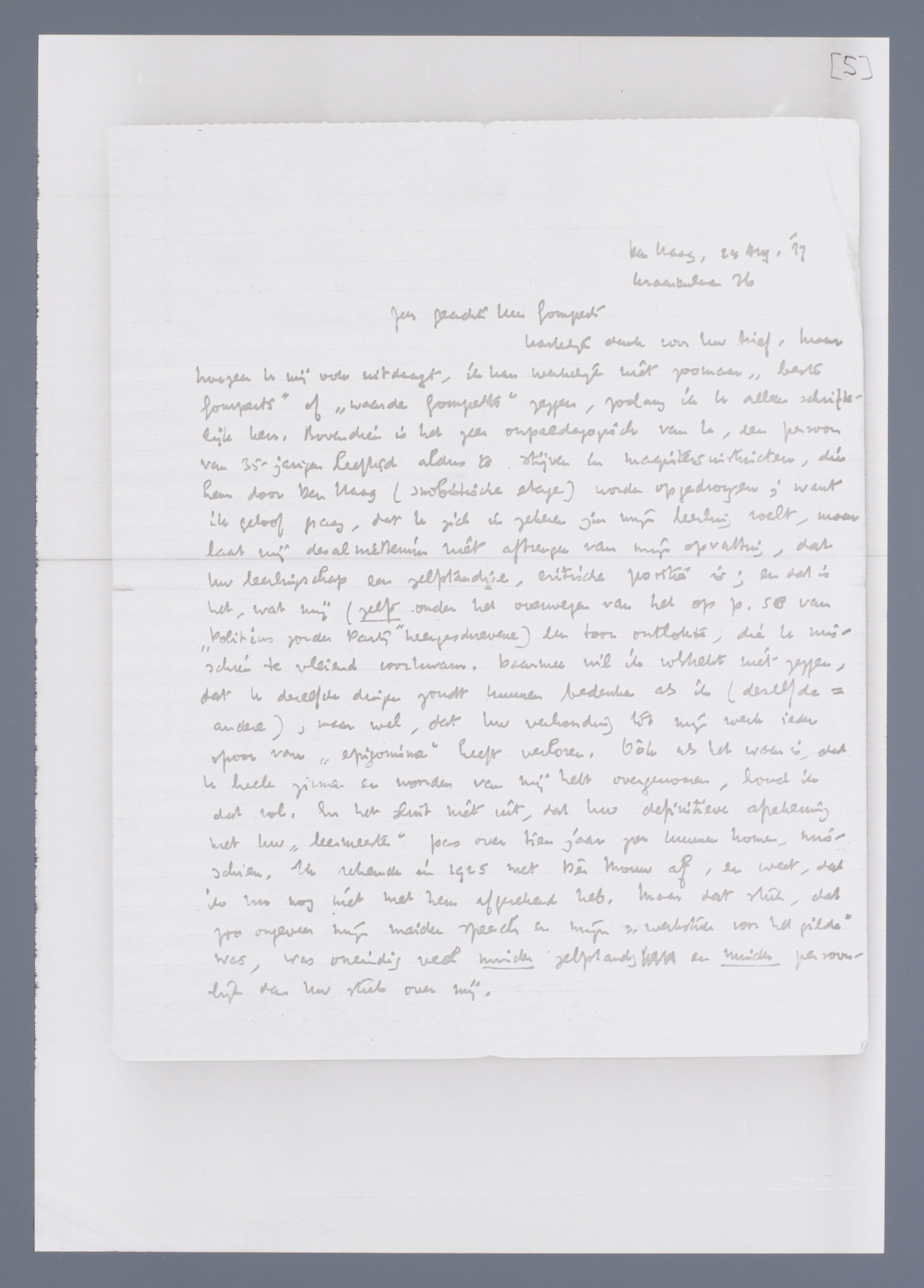 Hartelijk dank voor Uw brief, maar hoezeer U mij ook uitdaagt, ik kan werkelijk niet zoomaar ‘beste Gomperts’ of ‘waarde Gomperts’ zeggen, zoolang ik U alleen schriftelijk ken. Bovendien is het zeer onpaedagogisch van U, een persoon van 35-jarigen leeftijd aldus te stijven in magisters-instincten, die hem door Den Haag (snobistische etage) worden opgedrongen; want ik geloof graag, dat U zich in zekeren zin mijn leerling voelt, maar laat mij desalniettemin niet afbrengen van mijn opvatting, dat Uw leerlingschap een zelfstandige, critische positie is; en dat is het, wat mij (zelfs onder het overwegen van het op p. 58 van ‘Politicus zonder Partij’ neergeschrevene) een toon ontlokte, die U misschien te vleiend voorkwam. Daarmee wil ik volstrekt niet zeggen, dat U dezelfde dingen zoudt kunnen bedenken als ik (dezelfde = andere), maar wel, dat Uw verhouding tot mijn werk ieder spoor van ‘epigonisme’ heeft verloren. Oòk als het waar is, dat U heele zinnen en woorden van mij hebt overgenomen, houd ik dat vol. En het sluit niet uit, dat Uw definitieve afrekening met Uw ‘leermeester’ pas over tien jaar zou kunnen komen, misschien. Ik rekende in 1925 met Dèr Mouw af, en weet, dat ik nu nog niet met hem afgerekend heb. Maar dat stuk, dat zoo ongeveer mijn maiden speech en mijn ‘werkstuk voor het gilde’ was, was oneindig veel minder zelfstandig en minder persoonlijk dan Uw stuk over mij.
