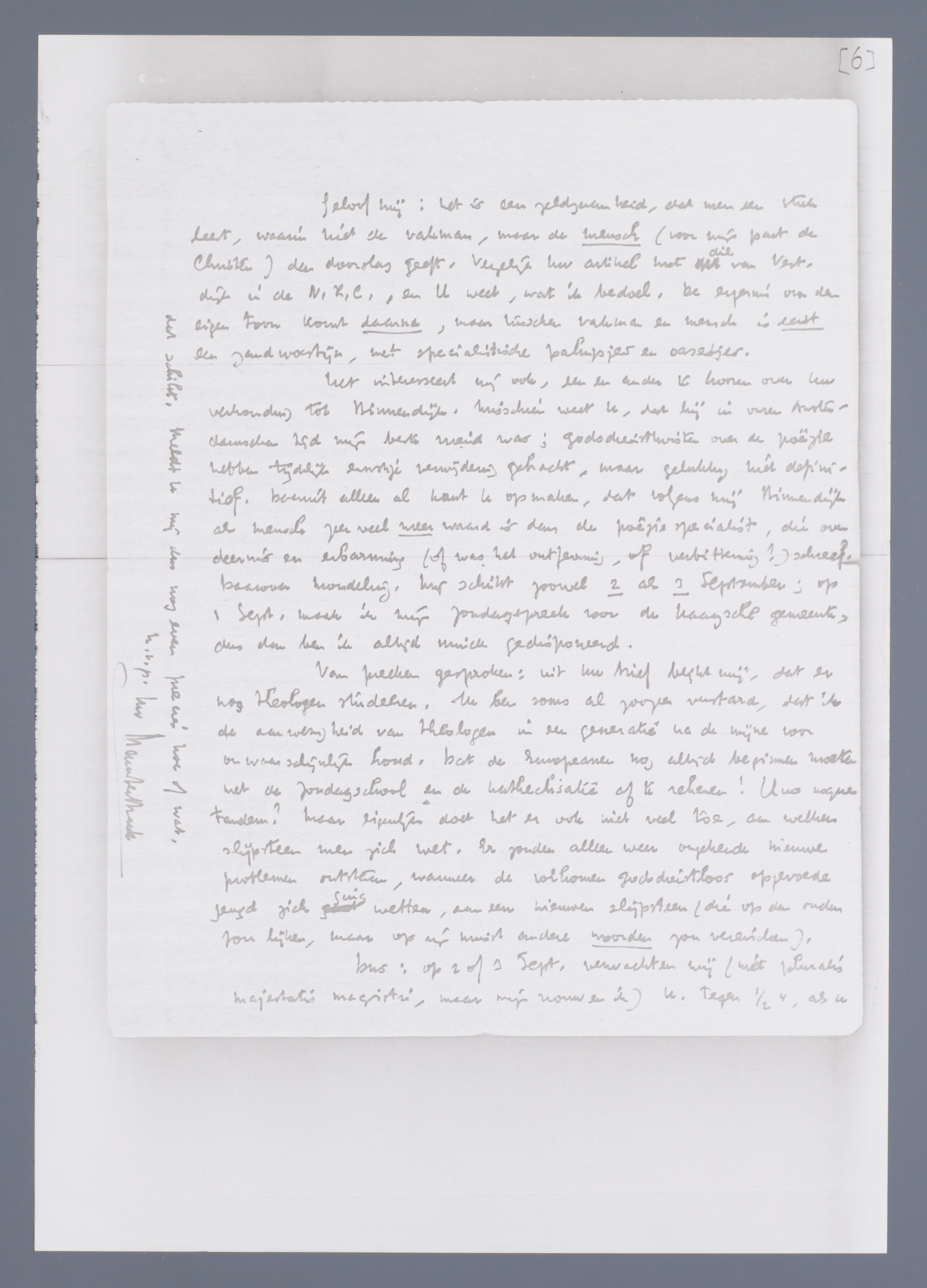 Van preeken gesproken: uit Uw brief blijkt mij dat er nog theologen studeeren. Ik ben soms al zoo ver verstard, dat ik de aanwezigheid van theologen in een generatie na de mijne voor onwaarschijnlijk houd. Dat de Europeanen nog altijd beginnen moeten met de Zondagschool en de kathechisatie af te rekenen! Quo usque tandem? Maar eigenlijk doet het er ook niet toe, aan welken slijpsteen men zich wet. Er zouden alleen weer ongekend nieuwe problemen ontstaan, wanneer de volkomen godsdienstloos opgevoede jeugd zich ging wetten, aan een nieuwe slijpsteen (die op den ouden zou lijken, maar op zijn minst andere woorden zou vereischen).