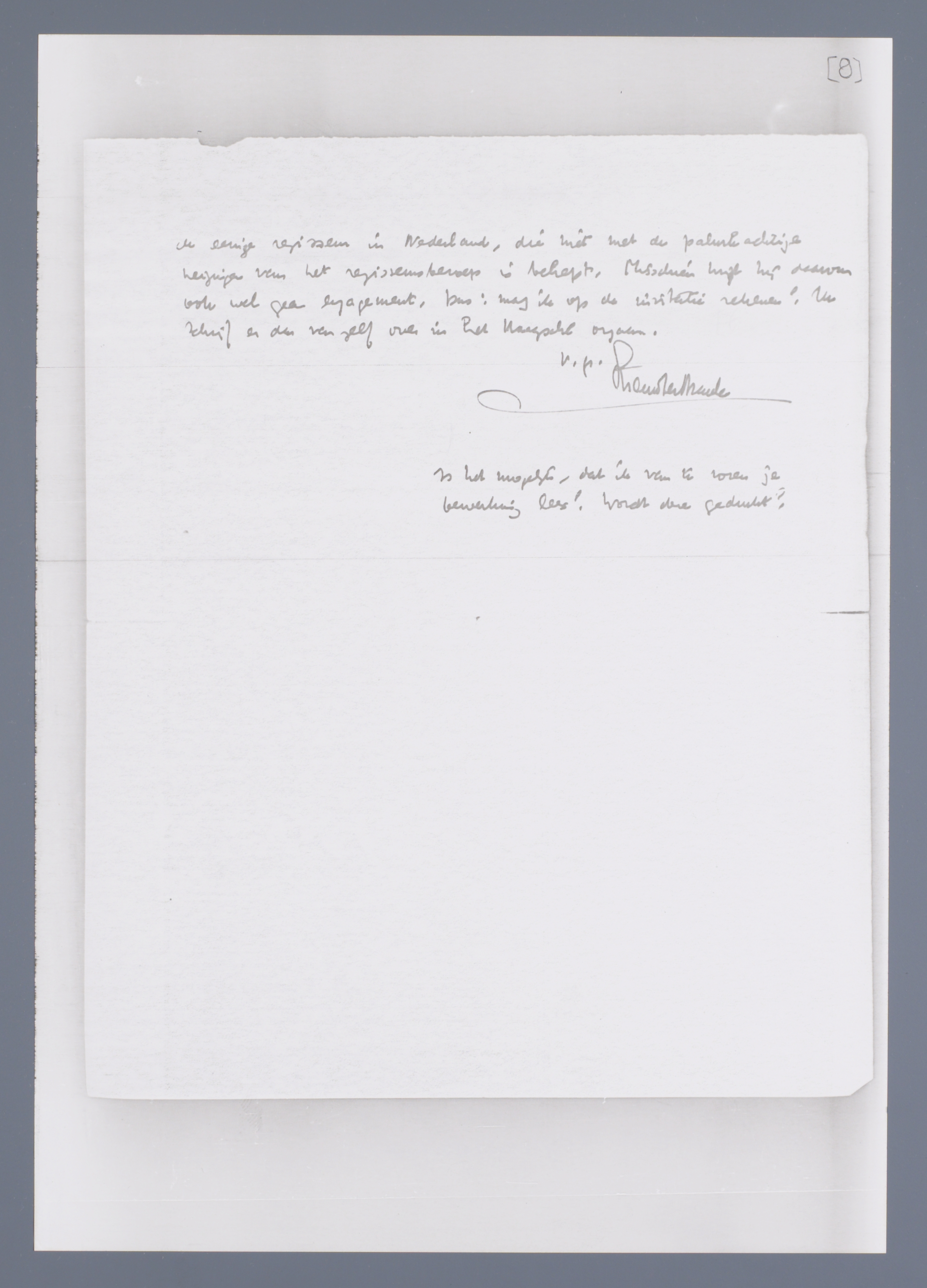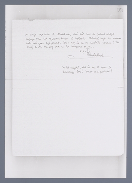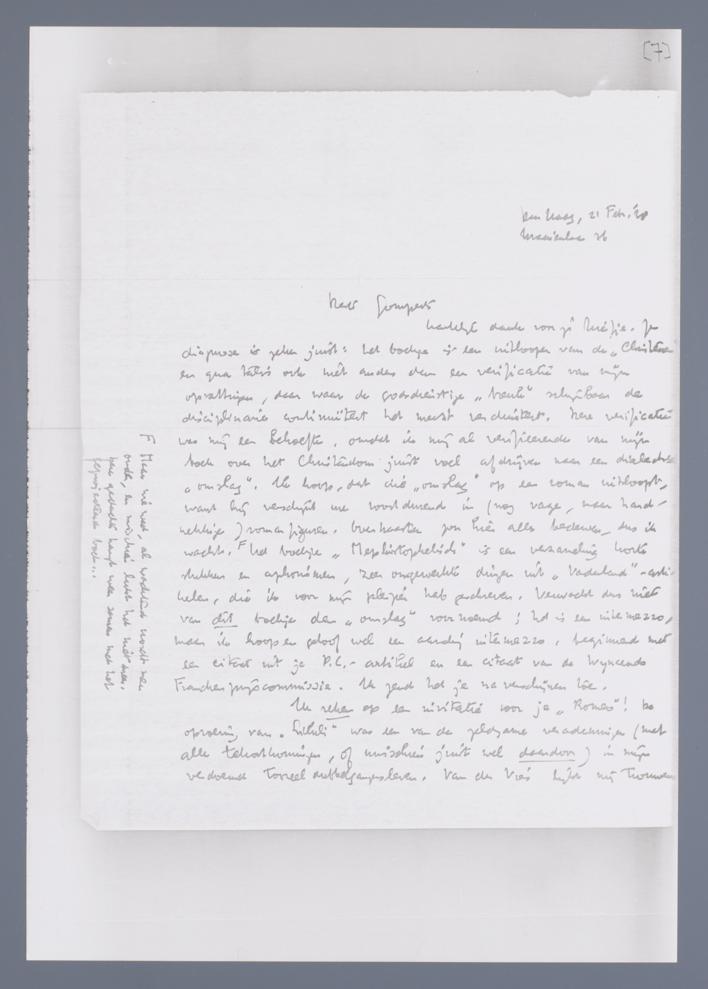 Hartelijk dank voor je briefje. Je diagnose is juist: het boekje is een uitlooper van de ‘Christenen’ en qua talis ook niet anders dan een verificatie van mijn opvattingen, daar waar de godsdienstige ‘breuk’ schijnbaar de disciplinaire continuïteit het meest verduistert. Deze verificatie was mij een behoefte, omdat ik mij al verifieerende van mijn boek over het Christendom juist voel afdrijven naar een dialectische ‘omslag’. Ik hoop, dat die ‘omslag’ op een roman uitloopt, want hij verschijnt me voortdurend in (nog vage, maar hardnekkige) romanfiguren. Overhaasten zou hier alles bederven, dus ik wacht. Maar wie weet, al wachtend wordt men ouder, en misschien lukt het niet meer. Deze gedachte hangt weer samen met het geprojecteerde boek... Het boekje ‘Mephistophelisch’ is een verzameling korte stukken en aphorismen, zeer omgewerkte dingen uit ‘Vaderland’-artikelen, die ik voor mijn plezier heb geschreven. Verwacht dus niet van dit boekje den ‘omslag’ voornoemd; het is een intermezzo, beginnend met een citaat uit je P.C.-artikel en een citaat van de Wijnands Francken prijscommissie. Ik zend het je na verschijnen toe.