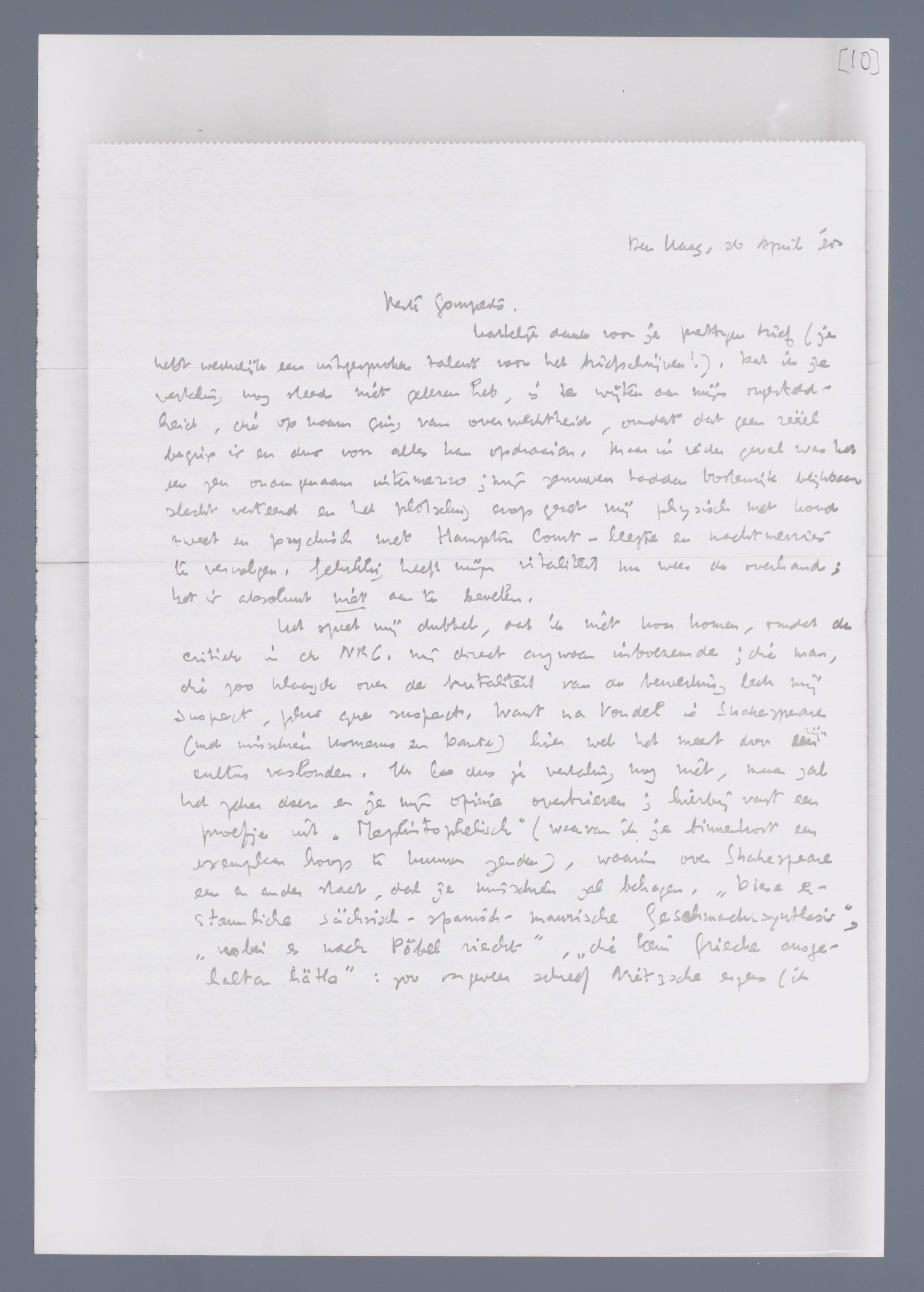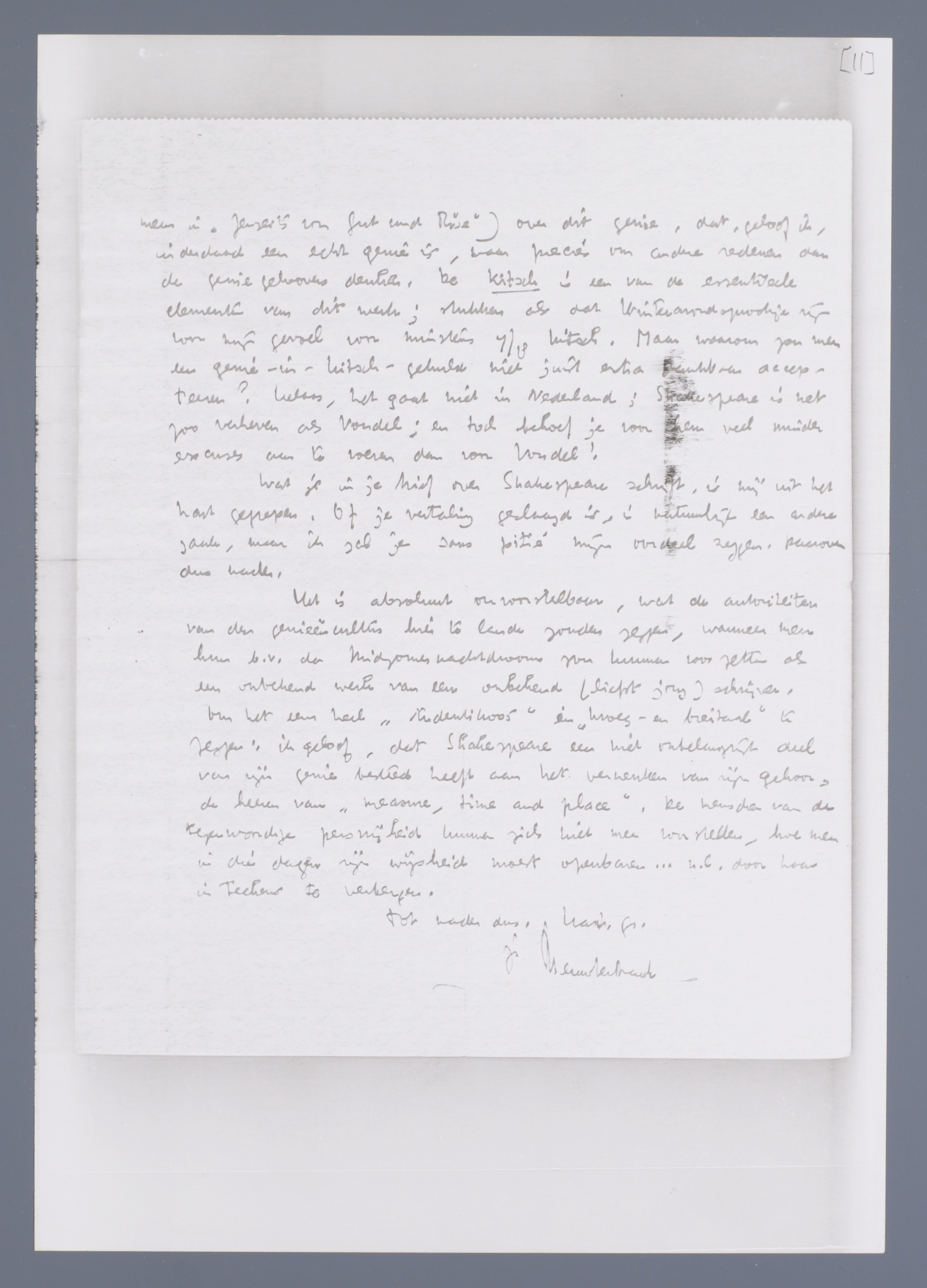Het speet mij dubbel, dat ik niet kon komen, omdat de critiek in de N.R.C. mij direct argwaan inboezemde; die man, die zoo klaagde over de brutaliteit van de bewerking, leek mij suspect, plus que suspect, want na Vondel is Shakespeare (met misschien Homerus en Dante) hier wel het meest door cultus verslonden. Ik las dus je vertaling nog niet, maar zal het zeker doen en je mijn opinie overbrieven; hierbij vast een proefje uit ‘Mephistophelisch’(waarvan ik je binnenkort een exemplaar hoop te kunnen zenden), waarin over Shakespeare een en ander staat, dat je misschien zal behagen. ‘Diese erstaunliche sächsisch-spanisch-maurische Geschmachssynthesis’, ‘wobei es nach Pöbel riecht’, ‘die kein Grieche ausgehalten hätte’: zoo ongeveer schreef Nietzsche ergens (ik meen in ‘Jenseits von Gut und Böse’) over dit genie, dat, geloof ik, inderdaad een echt genie is, maar precies om andere redenen dan de genie geloovers denken. De kitsch is een van de essentieele elementen van dit werk; stukken als dat Winteravondsprookje zijn voor mijn gevoel voor minstens 7/8 kitsch. Maar waarom zou men een genie-in-kitsch-gehuld niet juist extra dankbaar accepteeren? Helaas, het gaat niet in Nederland; Shakespeare is net zoo verheven als Vondel; en toch behoef je voor hem veel minder excuses aan te voeren dan voor Vondel!