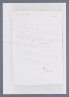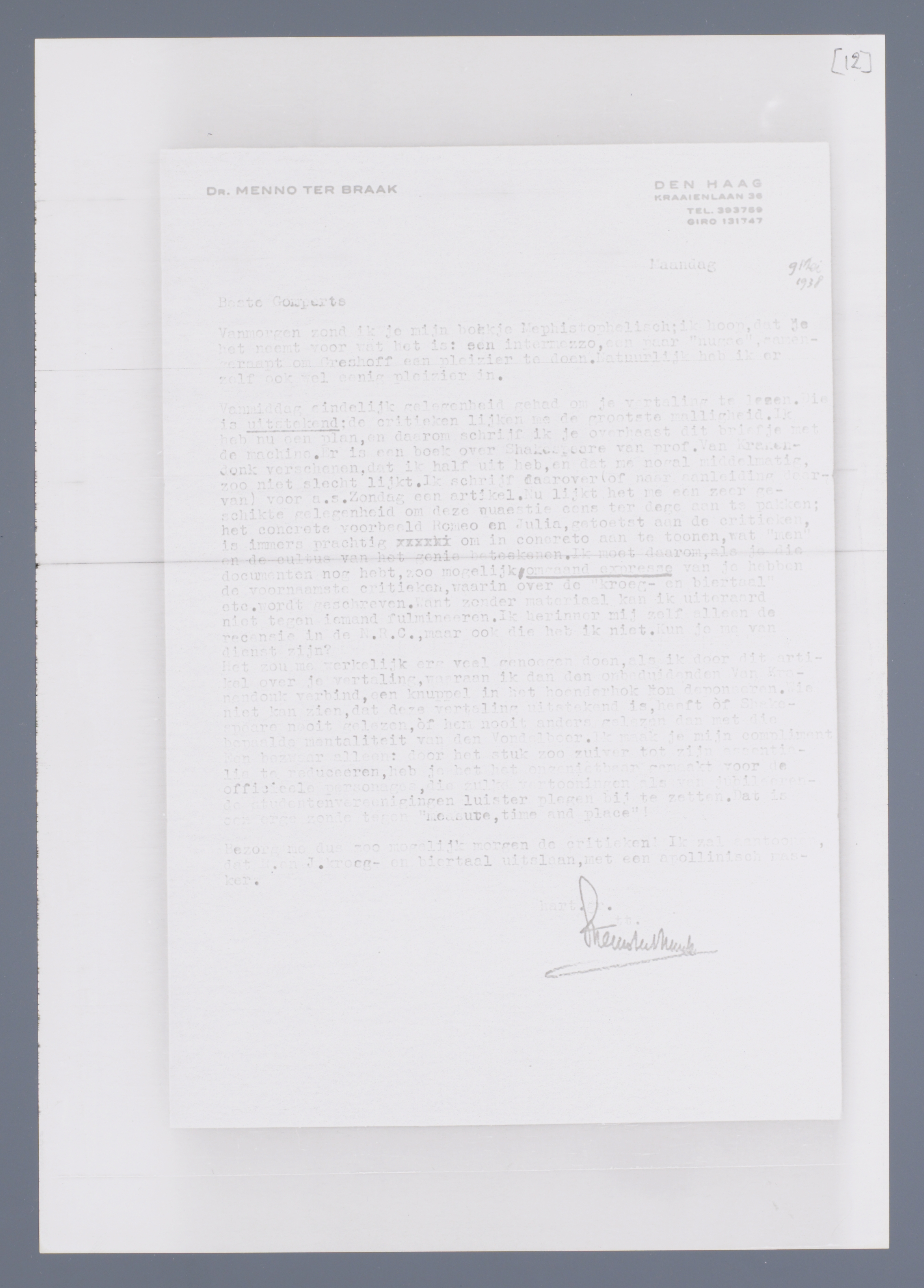 Vanmiddag eindelijk gelegenheid gehad om je vertaling te lezen. Die is uitstekend: de critieken lijken me de grootste malligheid. Ik heb nu een plan, en daarom schrijf ik je overhaast dit briefje met de machine. Er is een Shakespeare van prof. Van Kranendonk verschenen, dat ik half uit heb, en dat nogal middelmatig, zo niet slecht lijkt. Ik schrijf daarover (of naar aanleiding daarvan) voor a.s. Zondag een artikel. Nu lijkt het me een zeer geschikte gelegenheid om deze quaestie eens ter dege aan te pakken; het concrete voorbeeld Romeo en Julia, getoetst aan de critieken, is immers prachtig om in concreto aan te toonen, wat ‘men’ en de cultus van het genie beteekenen. Ik moet daarom, als je die documenten nog hebt, zoo mogelijk omgaand expresse van je hebben de voornaamste critieken, waarin over de ‘kroeg- en biertaal’ etc. wordt geschreven. Want zonder materiaal kan ik uiteraard niet tegen iemand fulmineeren. Ik herinner mij zelf alleen de recensie in de N.R.C., maar ook die heb ik niet. Kun je me van dienst zijn?