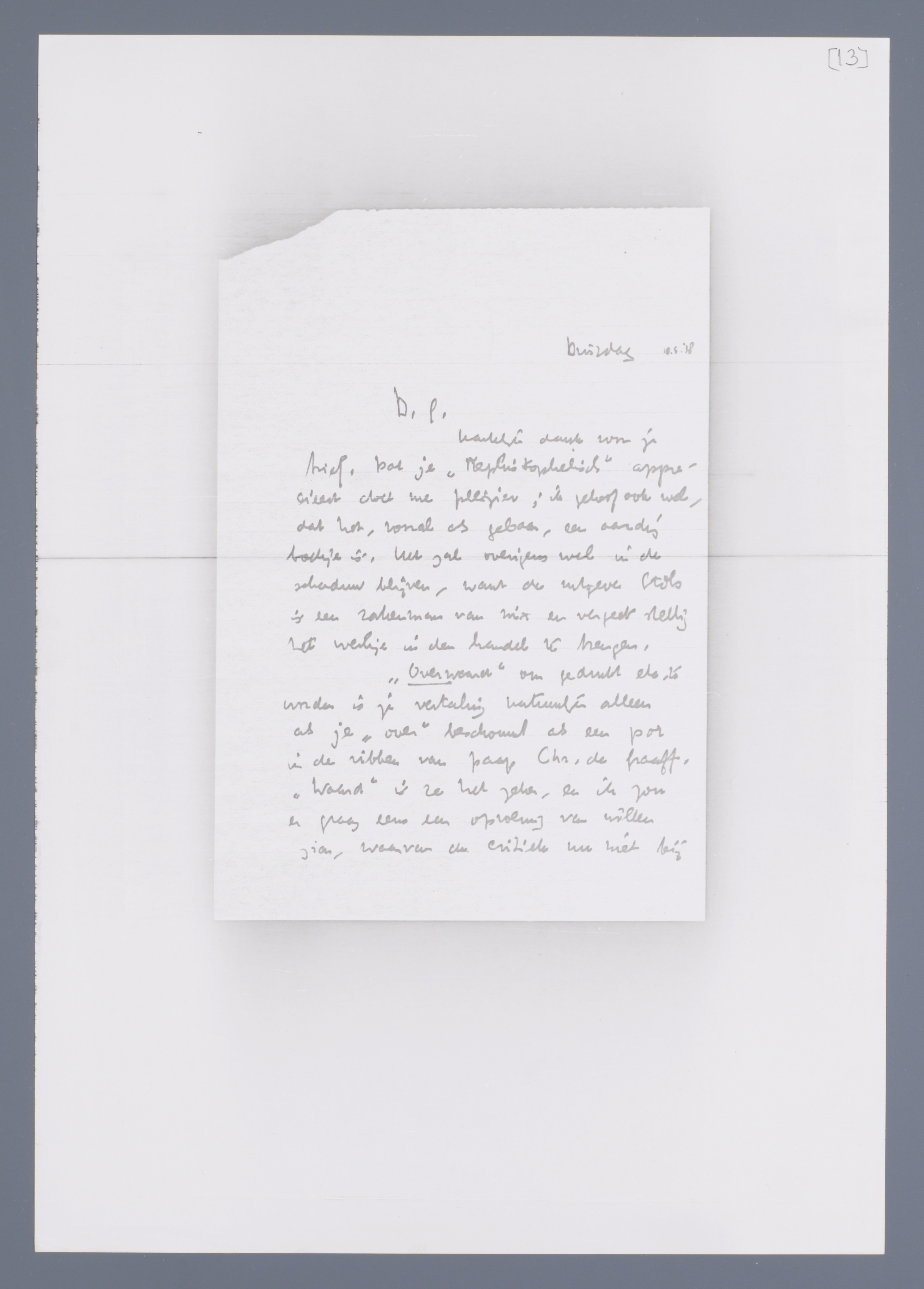 Hartelijke dank voor je brief. Dat je ‘Mephistophelisch’ apprecieert doet me pleizier; ik geloof ook wel, dat het, vooral als gebaar, een aardig boekje is. Het zal overigens wel in de schaduw blijven, want de uitgever Stols is een zakenman van nix en vergeet stellig het werkje in den handel te brengen.