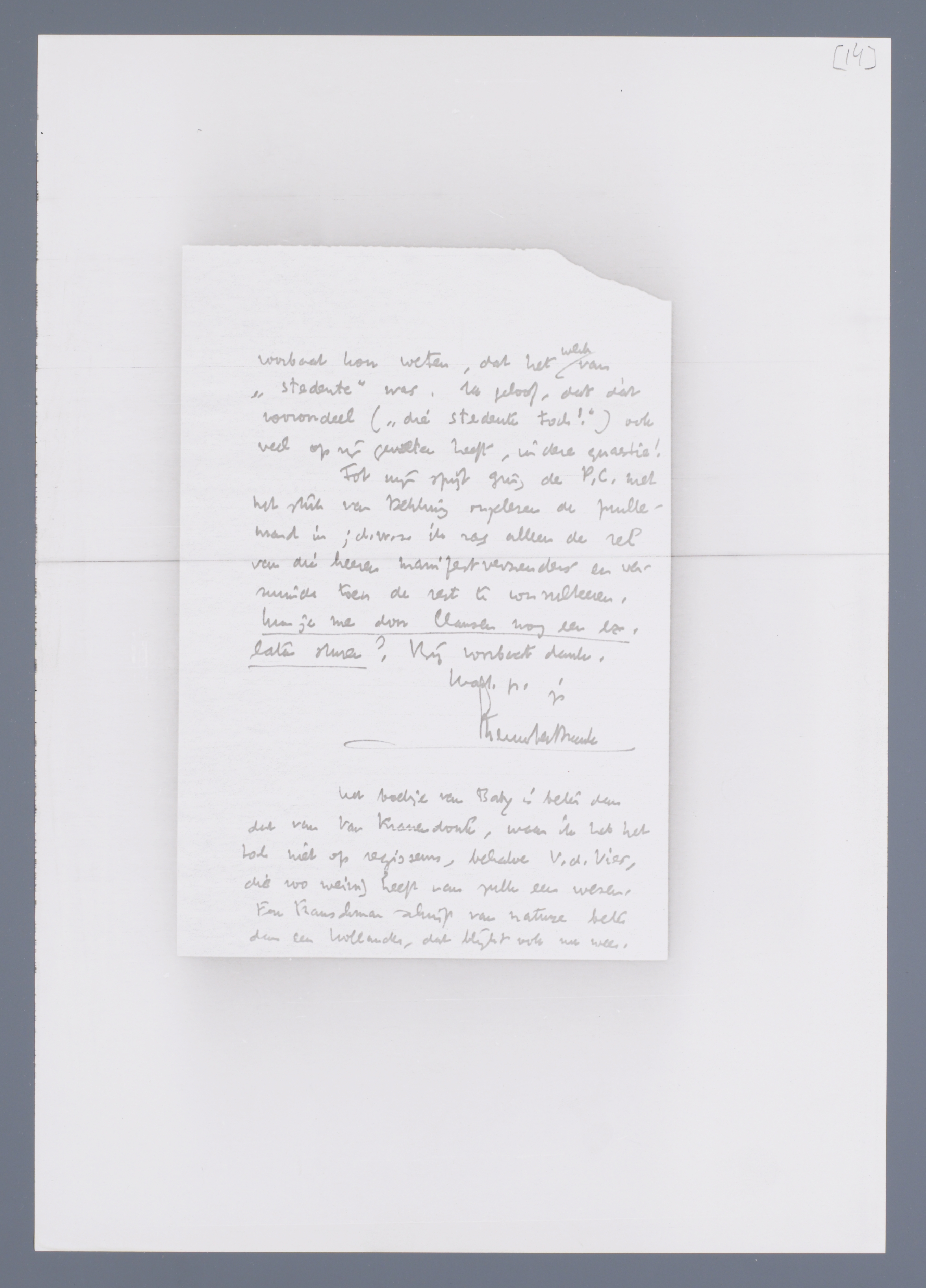 Tot mijn spijt ging de P.C. met het stuk van Dekking ongelezen de prullemand in; d.w.z. ik zag alleen de rel van die heeren manifest verzenders en verzuimde toen de rest te consulteeren. Kun je me door Clausen nog een ex. laten sturen? Bij voorbaat dank.
