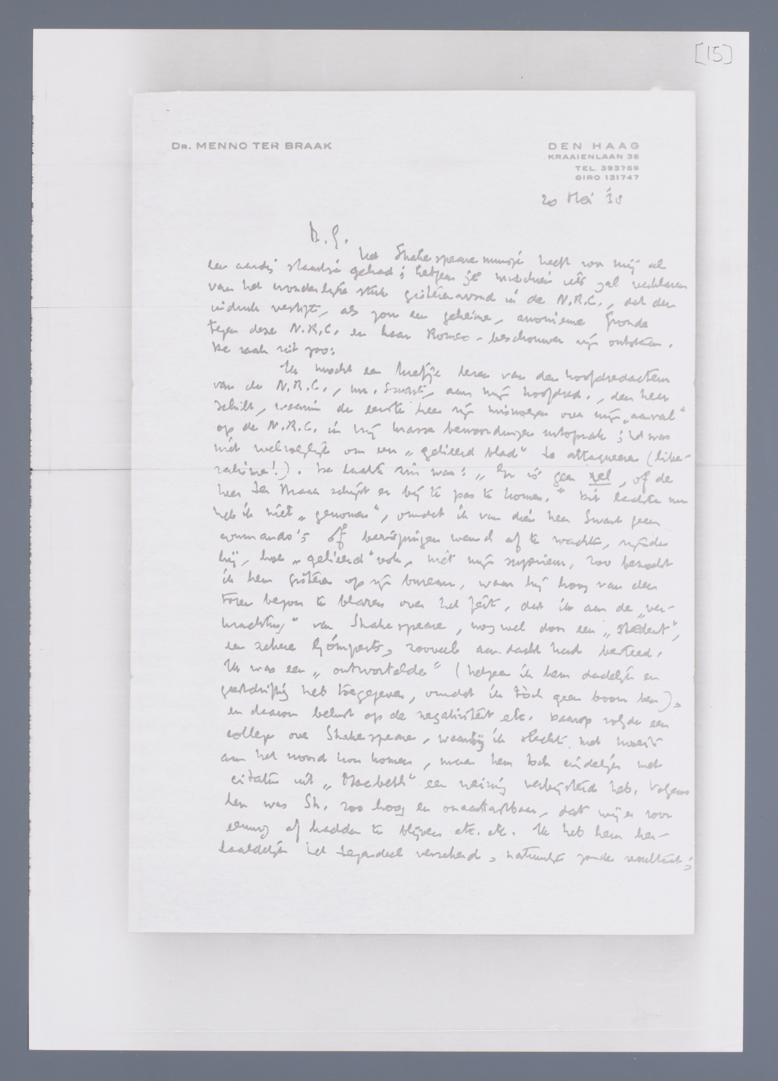 Het Shakespeare muisje heeft voor mij al een aardig ‘staartje’ gehad; hetgeen je misschien iets zal verklaren van het wonderlijke stuk gisterenavond in de N.R.C., dat den indruk vestigt, als zou een geheime, anonieme Fronde tegen deze N.R.C. en haar Romeo-beschouwer zijn ontstaan.