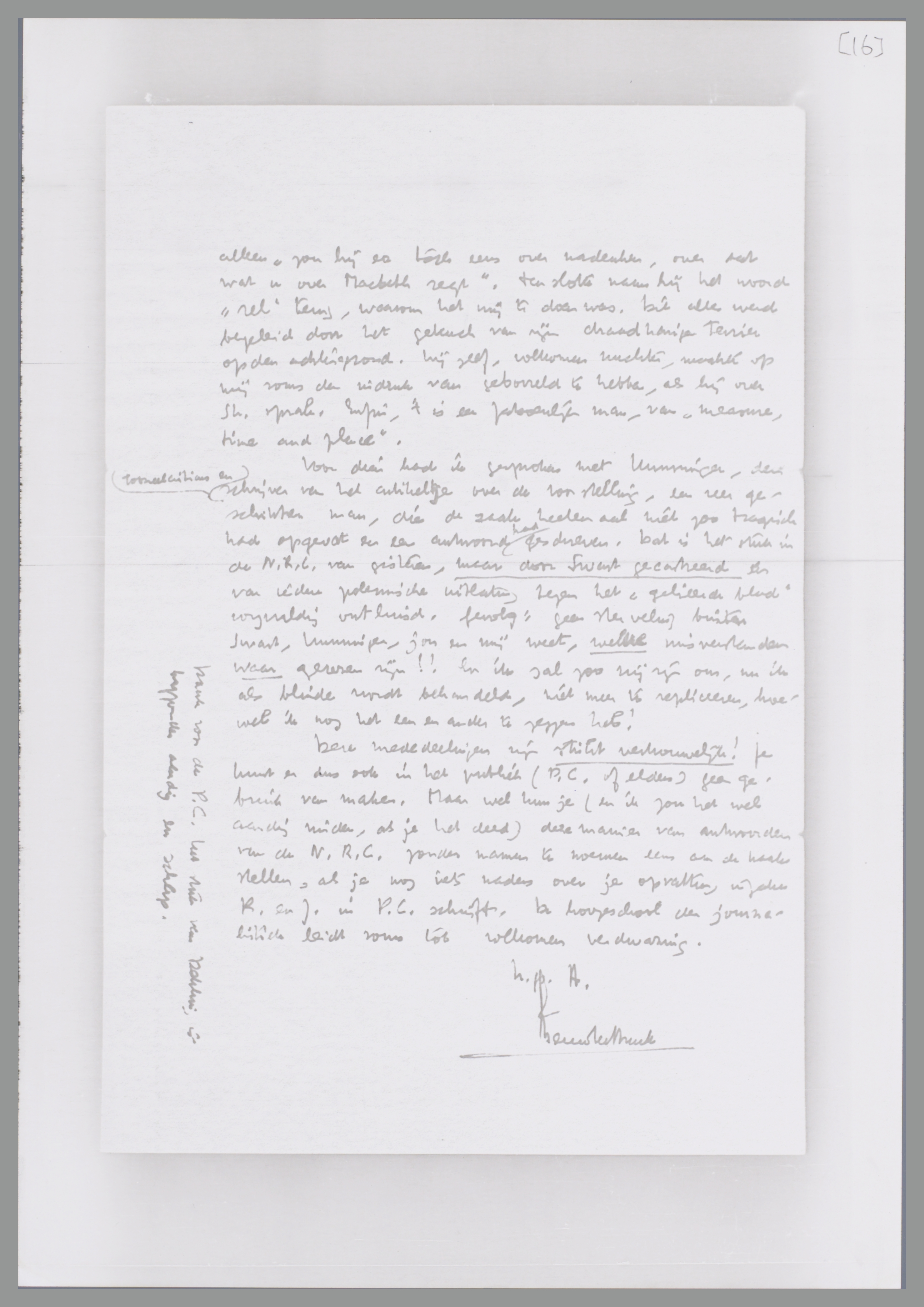 Deze mededeelingen zijn strikt vertrouwelijk! Je kunt er dus ook in het publiek (P.C. of elders) geen gebruik van maken. Maar wel kun je (en ik zou het wel aardig vinden, als je het deed) deze manier van antwoorden van het N.R.C. zonder namen te noemen eens aan de kaak stellen, als je nog iets naders over je opvatting inzake R. en J. in P.C. schrijft. De hoogeschool der journalistiek leidt soms tot volkomen verdwazing.