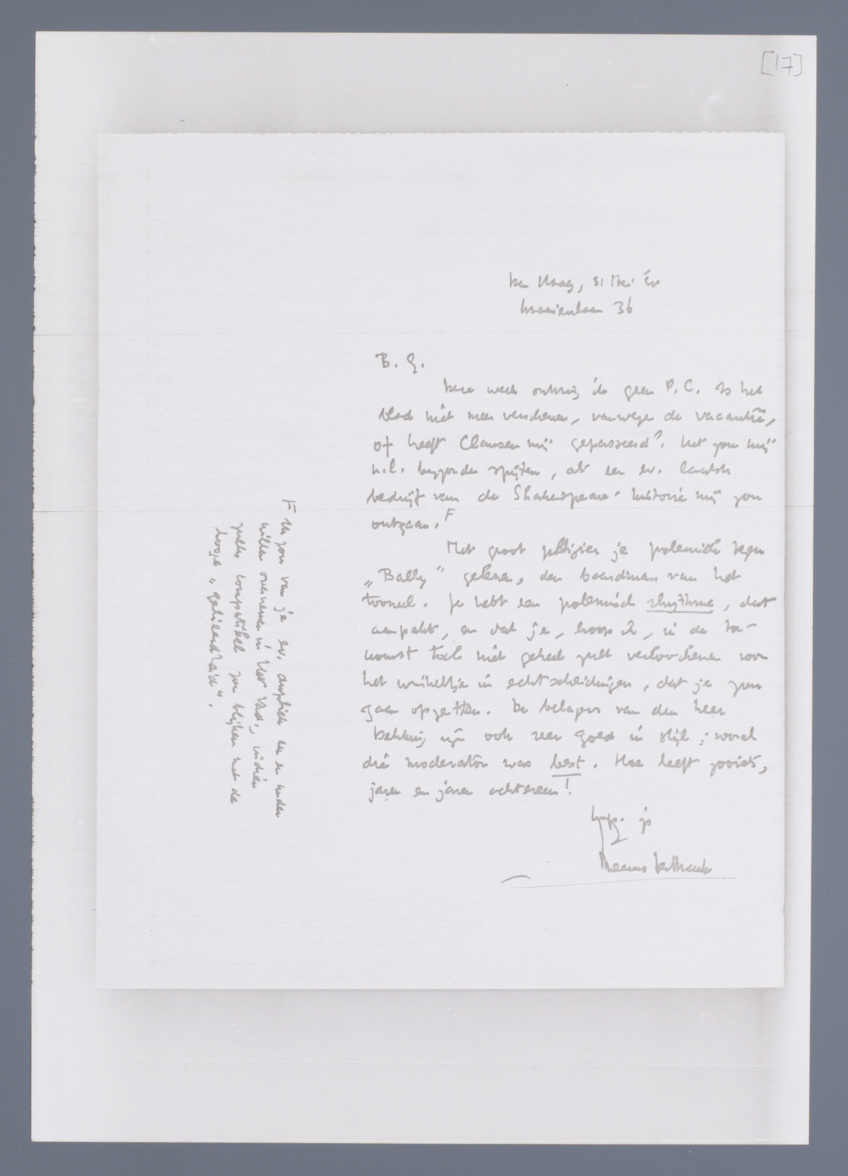 Deze week ontving ik geen P.C. Is het blad niet meer verschenen, vanwege de vacantie, of heeft Clausen mij gepasseerd? Het zou mij n.l. bijzonder spijten, als een ev. laatste bedrijf van de Shakespeare-historie mij zou ontgaan. Ik zou van je ev. dupliek een en ander willen overnemen in Het Vad., indien zulks compatibel zou blijken met de hooge ‘gelieerdheid’.