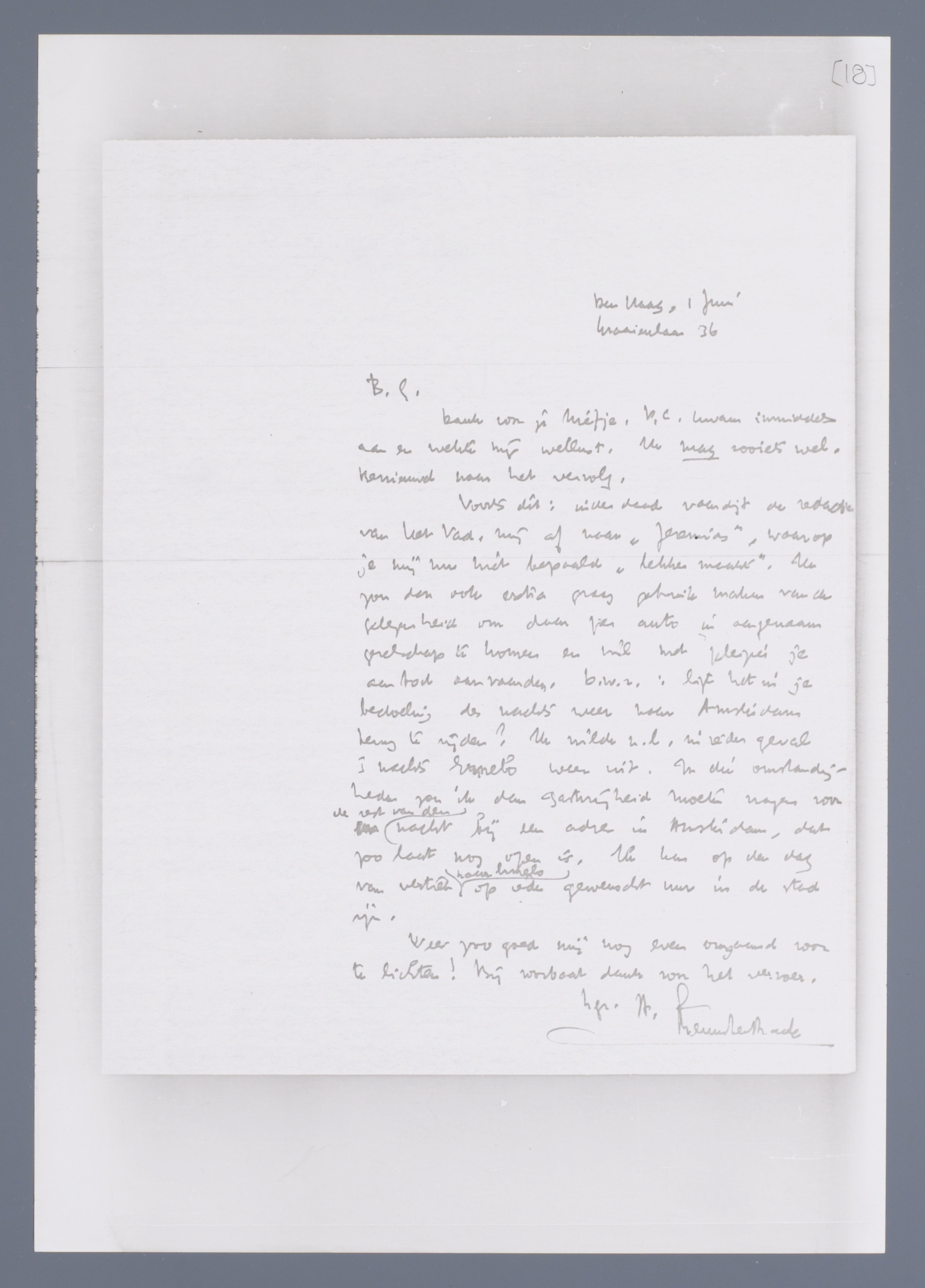 Voorts dit: inderdaad vaardigt de redactie van Het Vad. mij af naar ‘Jeremias’, waarop je mij nu niet bepaald ‘lekker maakt’. Ik zou dan ook extra graag gebruik maken van de gelegenheid om daar per auto in aangenaam gezelschap te komen en wil met plezier je aanbod aanvaarden. d.w.z.: ligt het in je bedoeling des nachts weer naar Amsterdam terug te rijden? Ik wilde n.l. in ieder geval 's nachts Ermelo weer uit. In die omstandigheden zou ik dan gastvrijheid moeten vragen voor de rest van de nacht bij een adres in Amsterdam, dat zoo laat nog open is. Ik kan op den dag van vertrek naar Ermelo op ieder gewenscht uur in de stad zijn.