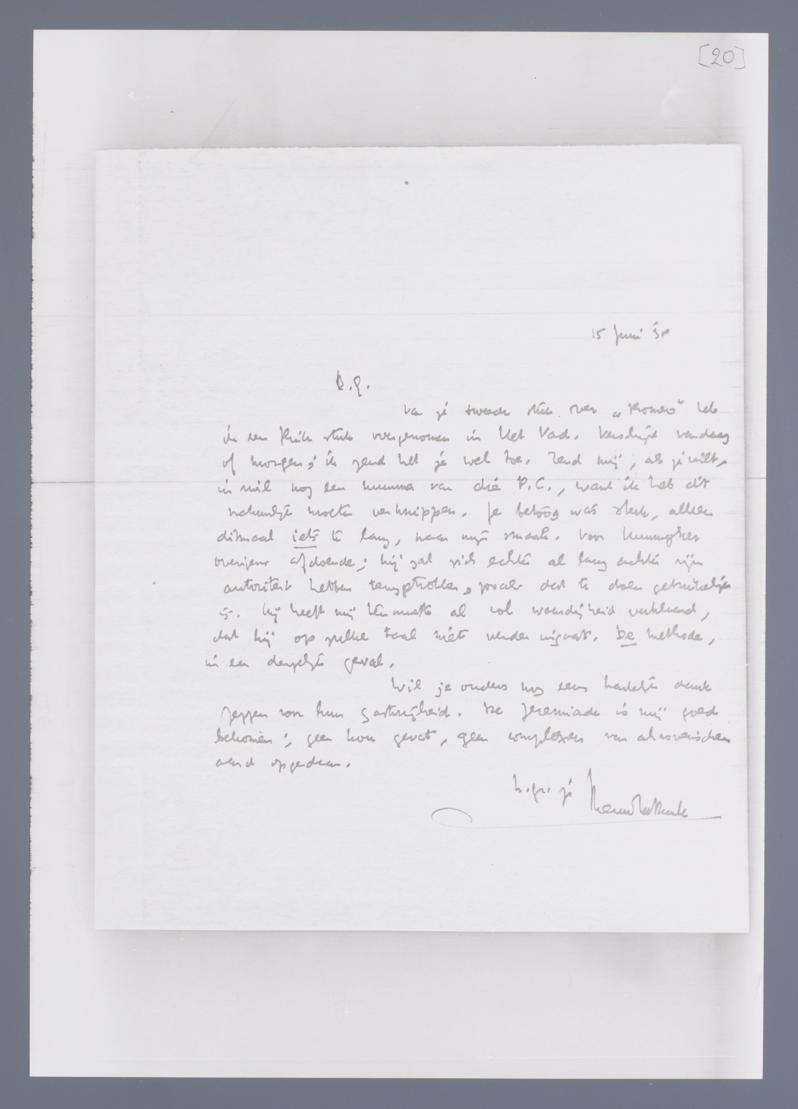 Van je tweede stuk over ‘Romeo’ heb ik een flink stuk overgenomen in Het Vad. Verschijnt vandaag of morgen; ik zend het je wel toe. Zend mij, als je wilt, in ruil nog een nummer van die P.C., want ik heb dit natuurlijk moeten verknippen. Je betoog was sterk, alleen ditmaal iets te lang, naar mijn smaak. Voor Hunningher overigens afdoende; hij zal zich echter al lang achter zijn autoriteit hebben teruggetrokken, zooals dat te doen gebruikelijk is. Hij heeft mij tenminste al vol waardigheid verklaard, dat hij op zulke taal niet verder ingaat. De methode, in een dergelijk geval.