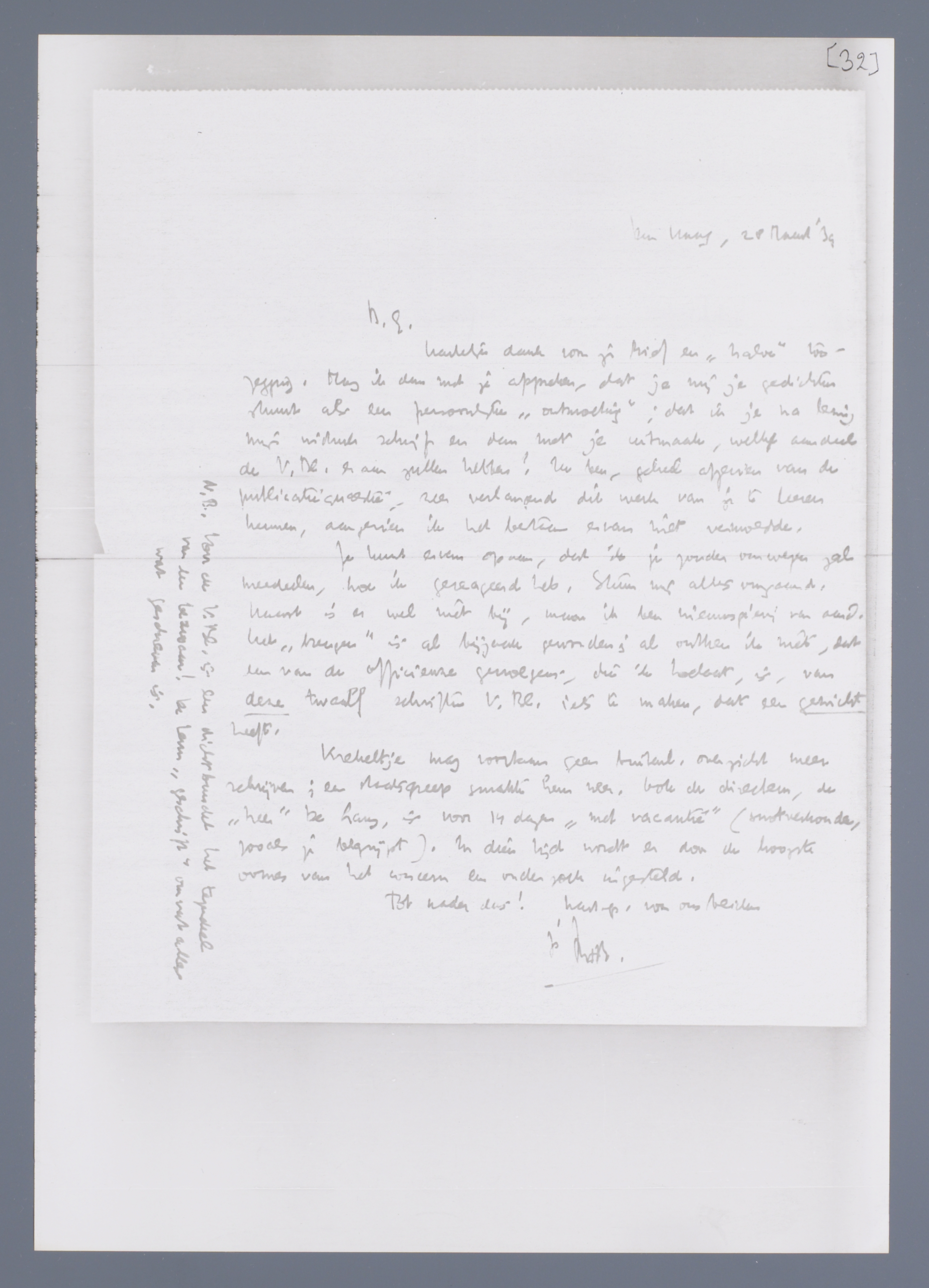 Je kunt ervan opaan, dat ik je zonder omwegen zal meedeelen, hoe ik gereageerd heb. Stuur mij alles omgaand. Haast is er wel niet bij, maar ik ben nieuwsgierig van aard. Het ‘brengen’ is al bijzaak geworden; al ontken ik niet, dat een van de officieuze genoegens, die ik toelaat, is, van deze twaalf schriften V.Bl. iets te maken, dat een gezicht heeft.