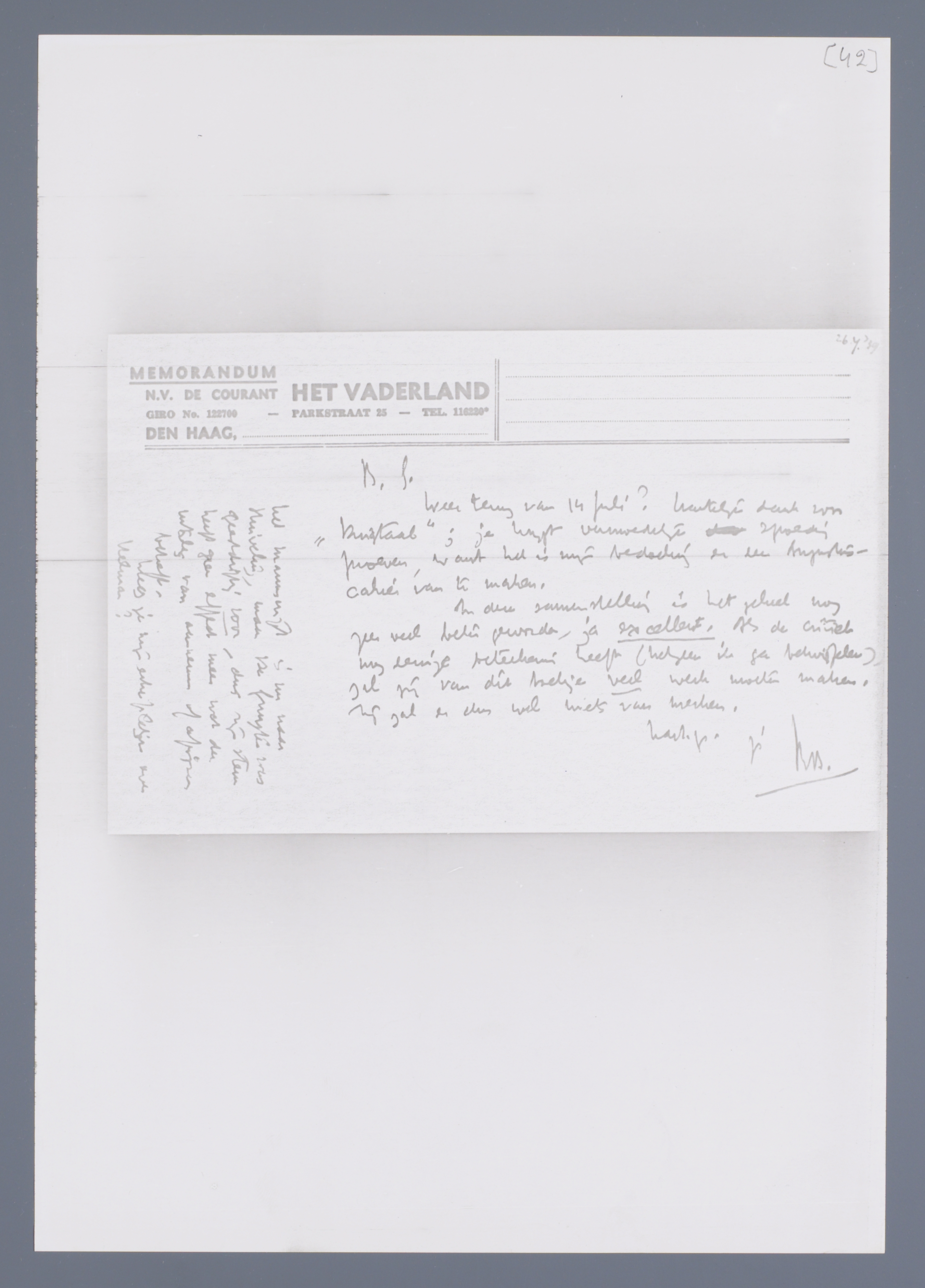 Weer terug van 14 Juli? Hartelijk dank voor ‘Dingtaal’; je krijgt vermoedelijk spoedig proeven, want het is mijn bedoeling er een Augustus-cahier van te maken.