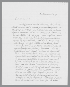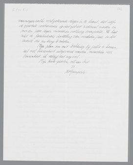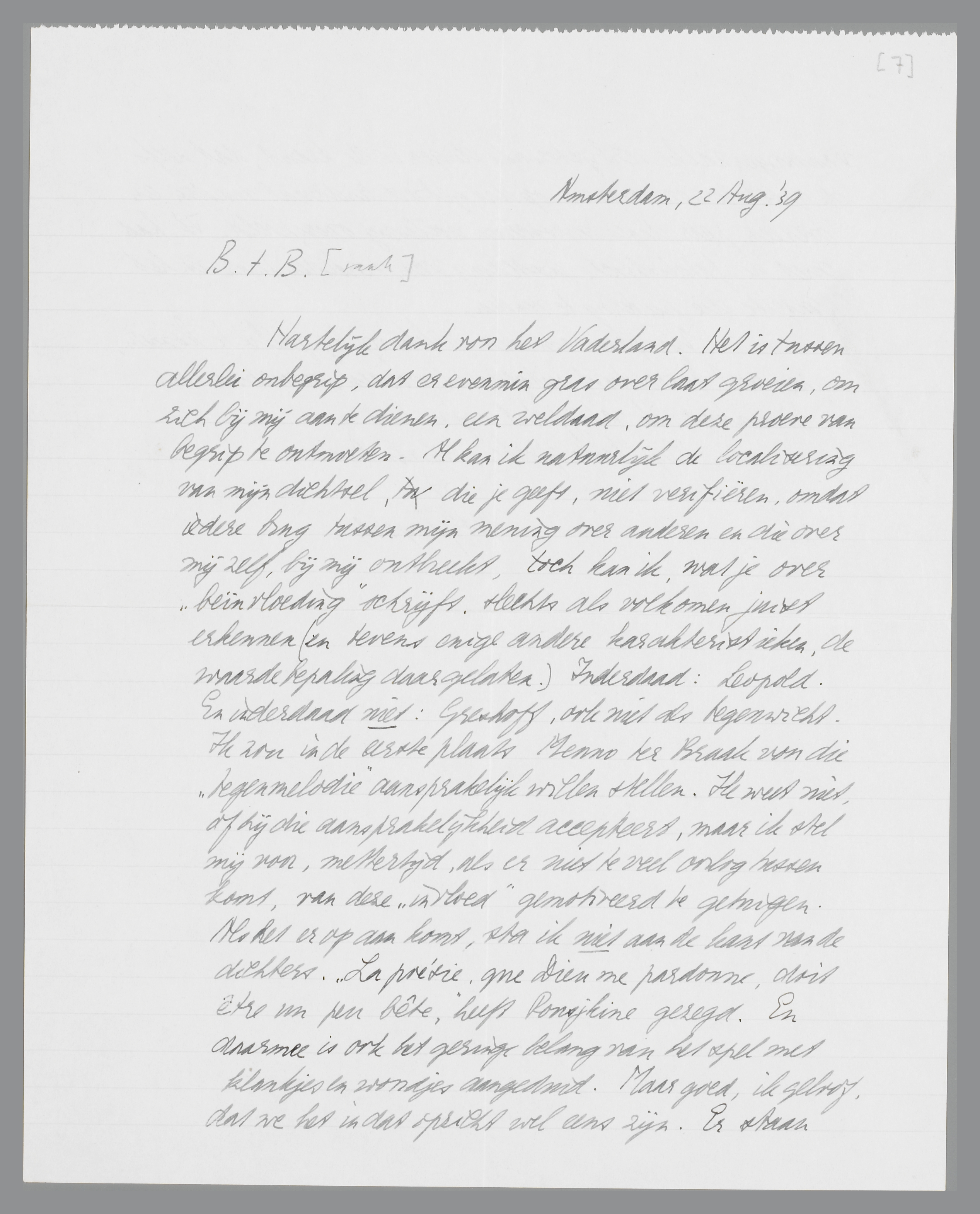 Hartelijk dank voor het Vaderland. Het is tussen allerlei onbegrip, dat er evenmin gras over laat groeien, om zich bij mij aan te dienen, een weldaad, om deze proeve van begrip te ontmoeten. Al kan ik natuurlijk de localisering van mijn dichtsel, die je geeft, niet verifiëren, omdat iedere brug tussen mijn mening over anderen en die over mij zelf, bij mij ontbreekt, toch kan ik, wat je over ‘beïnvloeding’ schrijft, slechts als volkomen juist erkennen (en tevens enige andere karakteristieken, de waardebepaling daargelaten.) Inderdaad: Leopold. En inderdaad niet: Greshoff, ook niet als tegenwicht. Ik zou in de eerste plaats Menno ter Braak voor die ‘tegenmelodie’ aansprakelijk willen stellen. Ik weet niet, of hij die aansprakelijkheid accepteert, maar ik stel mij voor, mettertijd, als er niet te veel oorlog tussen komt, van deze ‘invloed’ gemotiveerd te getuigen. Als het er op aan komt, sta ik niet aan de kant van de dichters. ‘La poésie, que Dieu me pardonne, doit être un peu bête’, heeft Ronsjkine gezegd. En daarmee is ook het geringe belang van het spel met klankjes en woordjes aangeduid. Maar goed, ik geloof, dat we het in dat opzicht wel eens zijn. Er staan vanmorgen zulke verbijsterende dingen in de krant, dat zelfs de grootste controversen op dat gebied ridicuul worden en over een paar dagen misschien volledig overspoeld. Ik had niet de fatalistische instelling van verleden jaar en heb moeite die nu terug te vinden.
