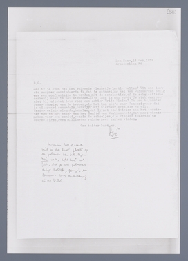 Mag ik je even met het volgende plannetje lastig vallen? Uit ons laatste gesprek concludeerde ik, dat je ontmoeting met Van Duinkerken bezig was een confrontatie te worden met de scholastiek, of de scholastische denkerij meer in het algemeen. Mijn idee is nu: wordt je stuk daarover niet bij uitstek iets voor een cahier Vrije Bladen? Ik zou bijzonder graag zooiets van je hebben, als het kon zelfs voor Januari; maar dat is uiteraard secundair. Schrijf mij hierover even, als je wilt.