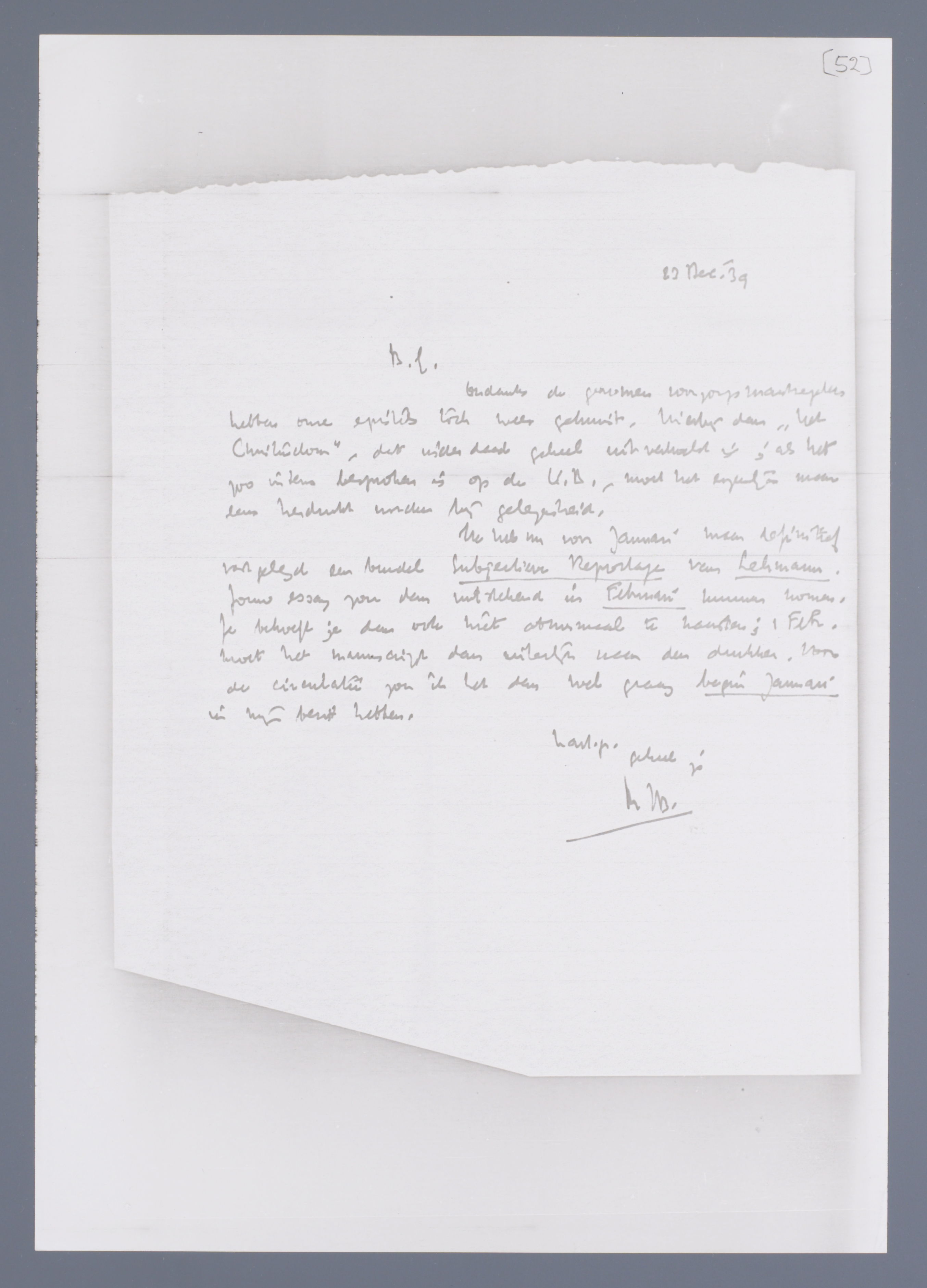 Ik heb nu voor Januari maar definitief vastgelegd een bundel Subjectieve Reportage van Lehmann. Jouw essay zou dan uitstekend in Februari kunnen komen. Je behoeft je dan ook niet abnormaal te haasten; 1 Febr. moet het manuscript dan uiterlijk naar den drukker. Voor de circulatie zou ik het dan wel graag begin Januari in mijn bezit hebben.