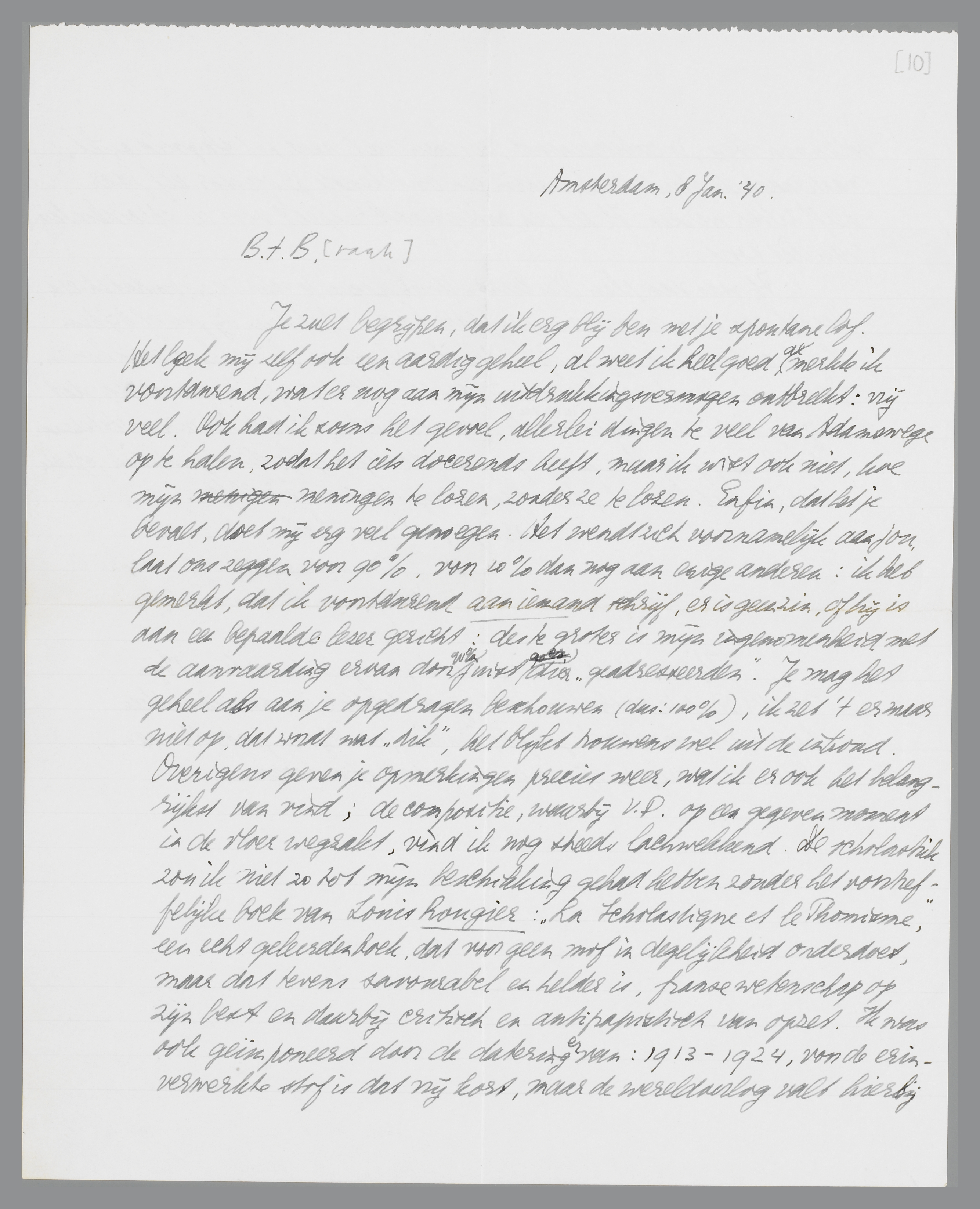 Je zult begrijpen, dat ik erg blij ben met je spontane lof. Het leek mij zelf ook een aardig geheel, al weet ik heel goed, al merkte ik voortdurend, wat er nog aan mijn uitdrukkingsvermogen ontbreekt: vrij veel. Ook had ik soms het gevoel, allerlei dingen te veel van [Adamswege] op te halen, zodat het iets docerends heeft, maar ik weet ook niet, hoe mijn meningen te lozen, zonder ze te lozen. Enfin, dat het je bevalt, doet mij erg veel genoegen. Het wendt zich voornamelijk aan jou, laat ons zeggen voor 90%, voor 10% dan nog aan enige anderen: ik heb gemerkt, dat ik voortdurend aan iemand schrijf, er is geen zin, of hij is aan een bepaalde lezer gericht: des te groter is mijn ingenomenheid met de aanvaarding ervan door 90% juist dier ‘geadresseerden’. Je mag het geheel als aan je opgedragen beschouwen (dus: 100%), ik zet 't er maar niet op, dat wordt wat ‘dik’, het blijkt trouwens wel uit de inhoud. Overigens geven je opmerkingen precies weer, wat ik er ook het belangrijkst van vind; de compositie, waarbij V.D. op een gegeven moment in de vloer wegzakt, vind ik nog steeds lachwekkend. De scholastiek zou ik niet zo tot mijn beschikking hebben zonder het voortreffelijke boek van Louis Rougier: ‘La Scolastique et le Thomisme’, een echt geleerdenboek, dat voor geen mof in degelijkheid onderdoet, maar dat tevens savourabel en helder is, franse wetenschap op zijn best en daarbij critisch en antipapistisch van opzet. Ik was ook geïmponeerd door de datering ervan: 1913-1924, voor de erin verwerkte stof is dat vrij kort, maar de wereldoorlog valt hierbij volkomen weg, is onbetekenend, als men niet naar het slagveld kijkt, maar naar de studeercel waarin een onbekende professor elf jaar heeft zitten werken. Ik heb een onbegrensd respect voor de specialisten van dit soort.