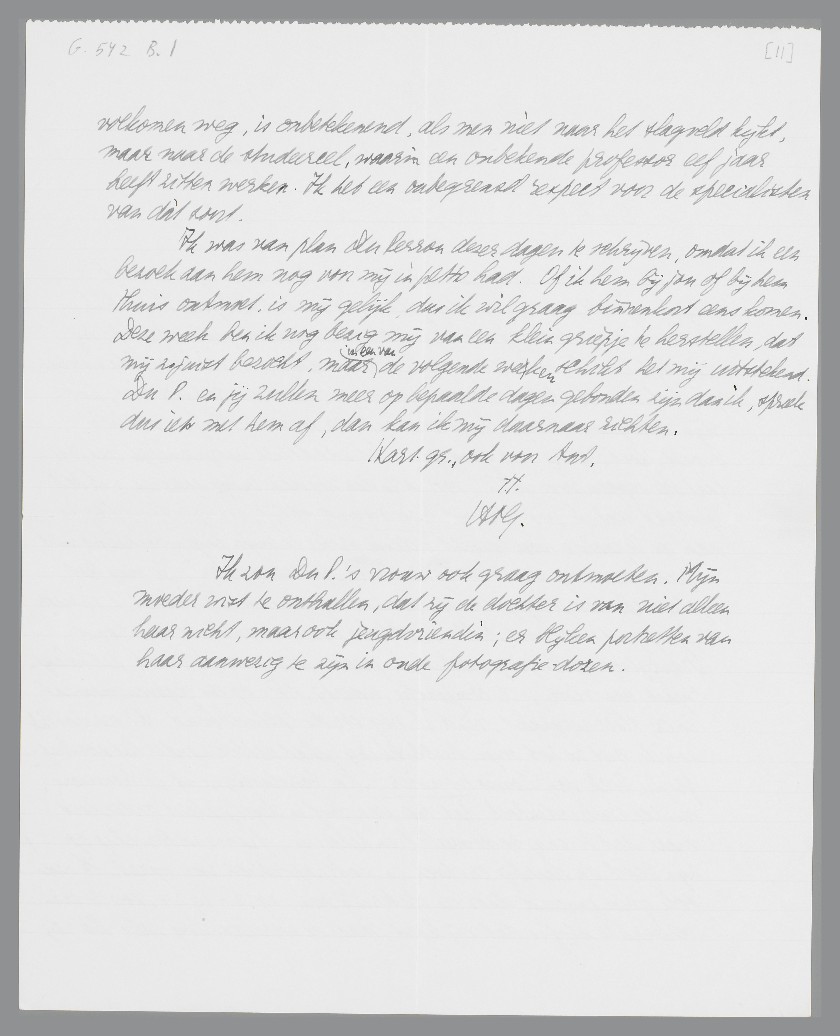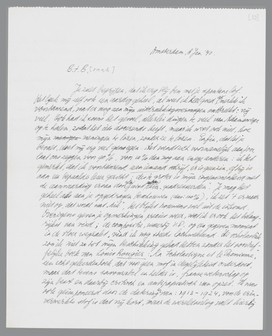 Ik was van plan Du Perron dezer dagen te schrijven, omdat ik een bezoek aan hem nog voor mij in petto had. Of ik hem bij jou of bij hem thuis ontmoet, is mij gelijk, dus ik wil graag binnenkort eens komen. Deze week ben ik nog bezig mij van een klein griepje te herstellen, dat mij zojuist bezoekt, maar in een van de volgende weken schikt het mij uitstekend. Du P. en jij zullen meer op bepaalde dagen gebonden zijn dan ik, spreek dus iets met hem af, dan kan ik mij daarnaar richten.