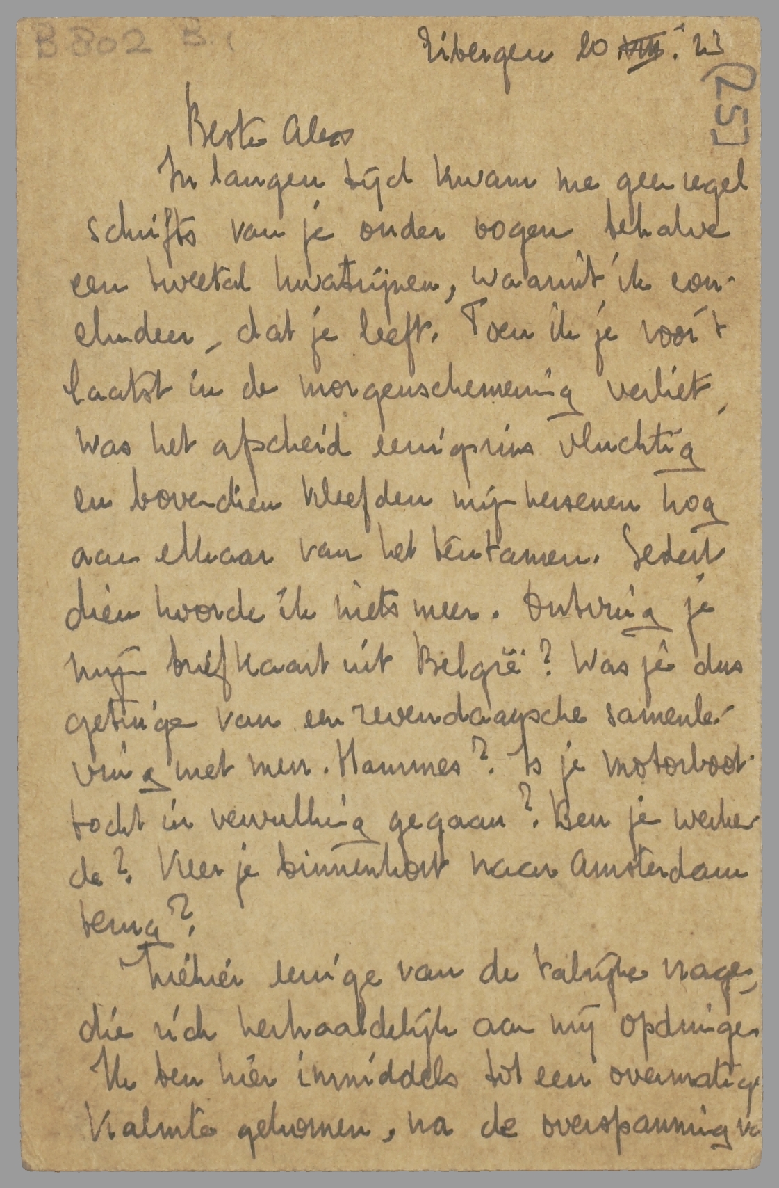 In langen tijd kwam me geen regel schrifts van je onder oogen behalve een tweetal kwatrijnen, waaruit ik concludeer, dat je leeft. Toen ik je voor 't laatst in de morgenschemering verliet, was het afscheid eenigszins vluchtig en bovendien kleefden mijn hersenen nog aan elkaar van het tentamen. Sedert dien hoorde ik niets meer. Ontving je mijn briefkaart uit België? Was je dus getuige van een zevendaagsche samenleving met mevr. Hammes? Is je motorboottocht in vervulling gegaan? Ben je werkende? Keer je binnenkort naar Amsterdam terug?