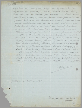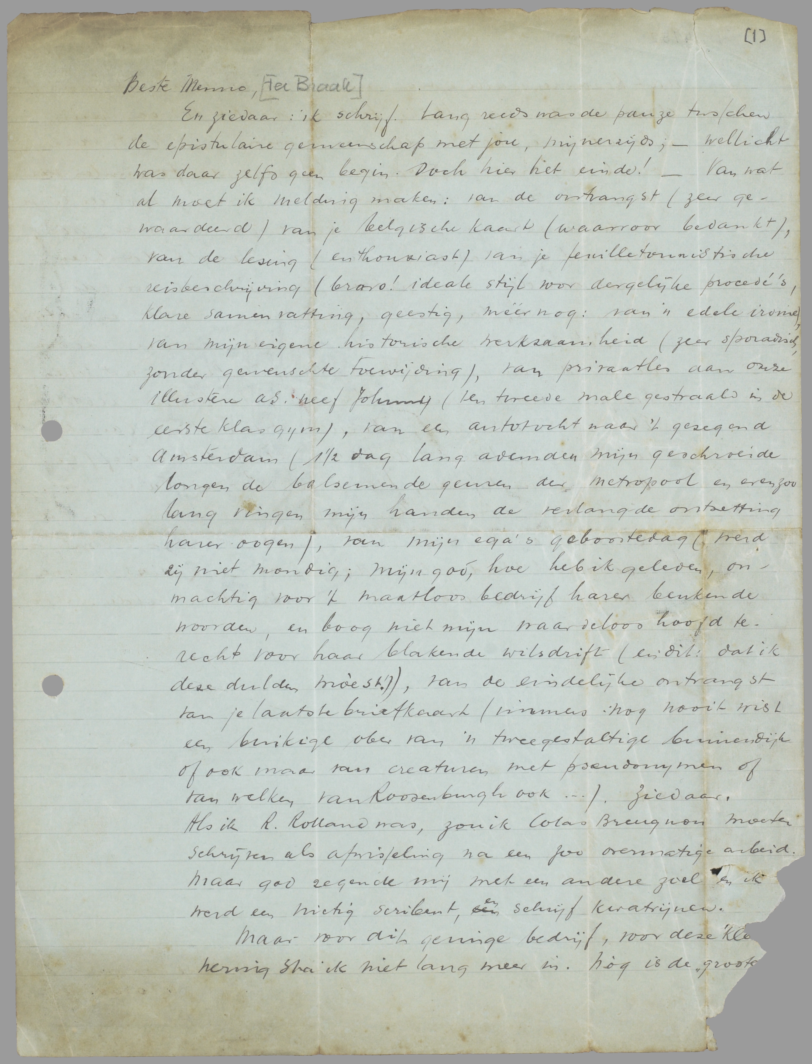 En ziedaar: ik schrijf. Lang reeds was de pauze tusschen de epistulaire gemeenschap met jou, mijnerzijds; - wellicht was daar zelfs geen begin. Doch hier het einde! - Van wat al moet ik melding maken: van de ontvangst (zeer gewaardeerd) van je belgische kaart (waarvoor bedankt), van de lezing (enthousiast) van je feuilletonnistische reisbeschrijving (bravo! ideale stijl voor dergelijke procedé's, klare samenvatting, geestig, méér nog: van 'n edele ironie), van mijn eigene historische werkzaamheid (zeer sporadisch, zonder gewenschte toewijding), van privaatles aan onze illustere a.s. neef Johnny (ten tweede male gestraald in de eerste klas gym), van een autotocht naar 't gezegend Amsterdam (12 dag lang ademden mijn geschroeide longen de balsemende geuren der metropool en evenzoo lang vingen mijn handen de verlangde ontzetting harer oogen), van mijn ega's geboortedag (werd zij niet mondig; mijn god, hoe heb ik geleden, onmachtig voor 't maatloos bedrijf harer beukende woorden, en boog niet mijn waardeloos hoofd terecht voor haar blakende wilsdrift (en dit: dat ik deze dulden mòest!), van de eindelijke ontvangst van je laatste briefkaart (immers: nog nooit wist een buikige ober van 'n tweegestaltige binnendijk of ook maar van creaturen met pseudonymen of van welken van Roosenburgh ook...), ziedaar. Als ik R. Rolland was, zou ik Colas Breugnon moeten schrijven als afwisseling na een zoo overmatige arbeid. Maar god zegende mij met een andere ziel en ik werd een nietig scribent, en schrijf kwatrijnen.