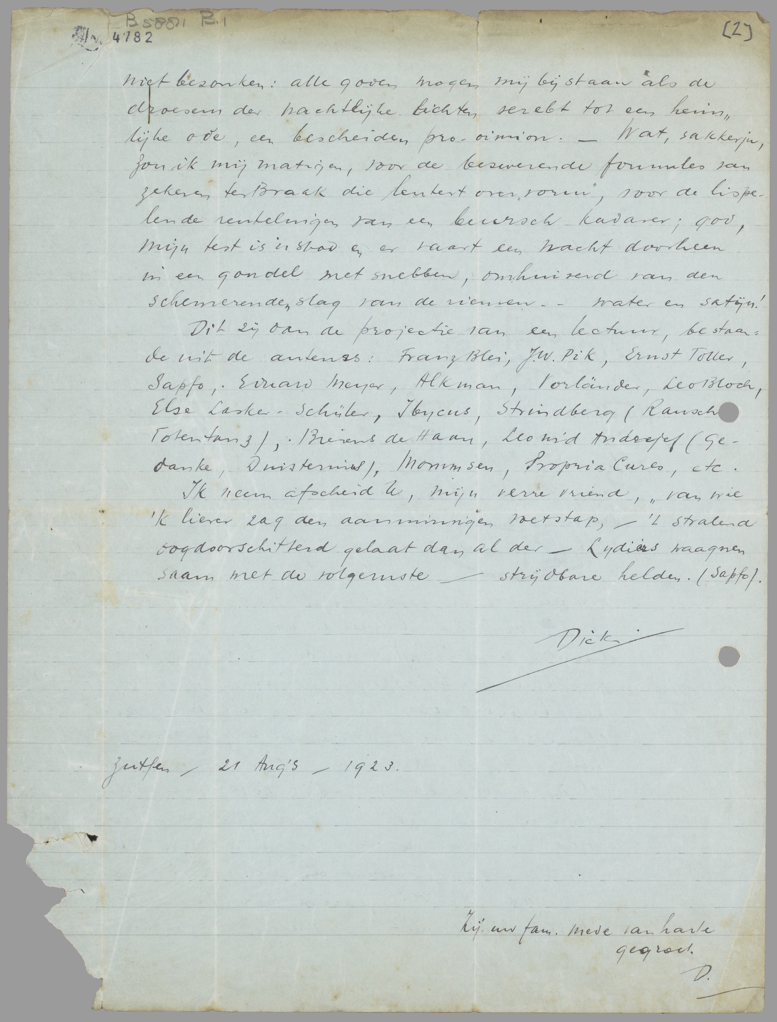 Dit zij dan de projectie van een lectuur, bestaande uit de auteurs: Franz Blei, J.W. Pik, Ernst Toller, Sapfo, Eduard Meyer, Alkman, Vorländer, Leo Bloch, Else Lasker-Schüler, Ibycus, Strindberg (Rausch Totentanz), Bierens de Haan, Leonid Andrejef (Gedanke, Duisternis),Mommsen, Propria Cures, etc.