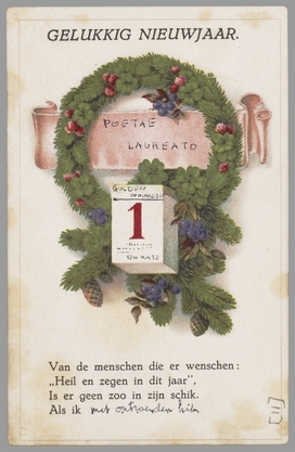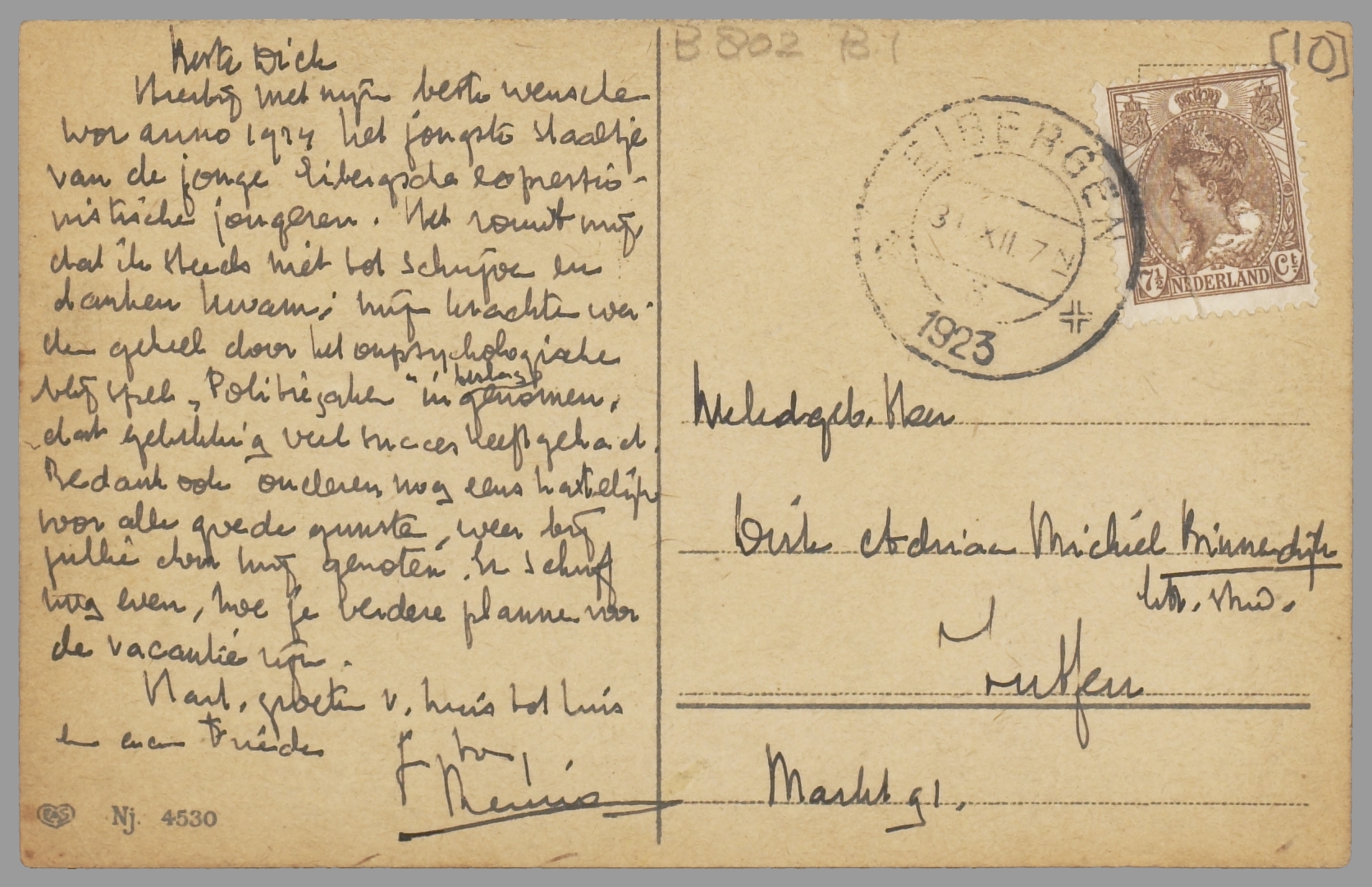 Hierbij met mijn beste wenschen voor anno 1924 het jongste staaltje van de jonge Eibergsche expressionistische jongeren. Het rouwt mij dat ik steeds niet tot schrijven en danken kwam; mijn krachten werden geheel door het onpsychologische blijspel ‘Politiezaken’ in beslag genomen, dat gelukkig veel succes heeft gehad. Bedank ook ouderen nog eens hartelijk voor alle goede gunsten, weer bij jullie door mij genoten. En schrijf nog even, hoe je verdere plannen voor de vacantie zijn.