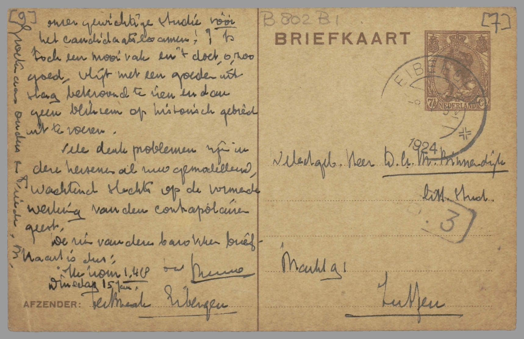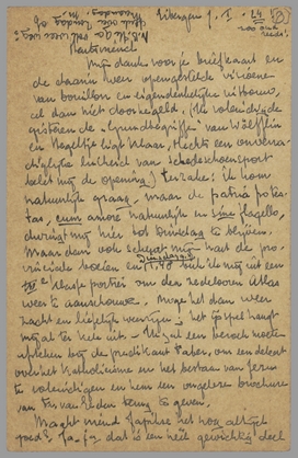 Mijn dank voor je briefkaart en de daarin weer opengestelde visioenen van bouillon en eigendenkelijke uitbouw, al dan niet doorhegeld. (Ik voleindigde gisteren de ‘Grundbegriffe’ van Wölfflin en Hegeltje ligt klaar, slechts een onverzadiglijke luiheid van schedeschoensport belet mij de opening.) Terzake: ik kom natuurlijk graag, maar de patria potestas, cum amore natuurlijk en sine flagello, dwingt mij hier tot Dinsdag te blijven. Maar dan ook scheurt mijn hart de provinciale boeien en Dinsdag a.s. 1.48 buk ik mij uit een IIIe klasse portier om den zedeloozen Atlas weer te aanschouwen. Moge het dan weer zacht en liefelijk weer zijn; het ijsspel hangt mij al ter kele uit. - Ik zal een bezoek moeten afsteken bij de predikant Faber, om een debat over het katholicisme en het bestaan van Jezus te voleindigen en hem een ongelezen brochure van Fr. van Eeden terug te geven.