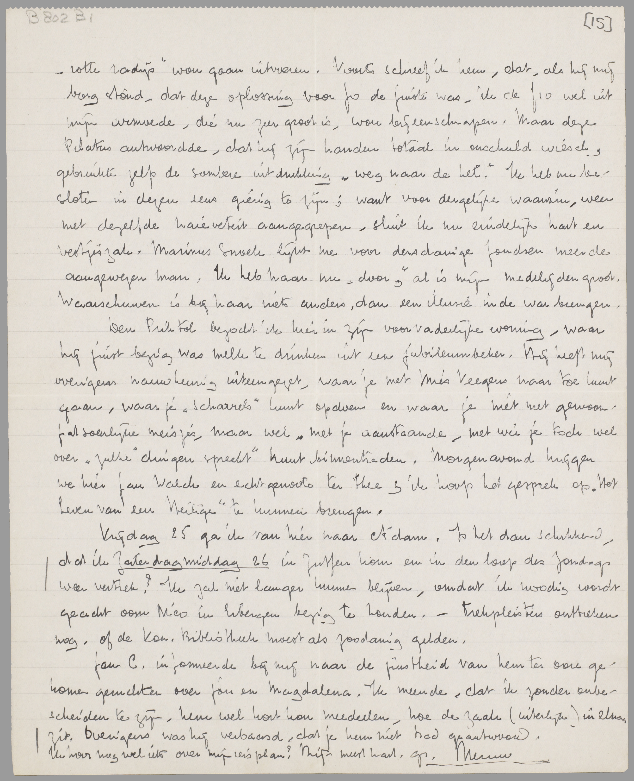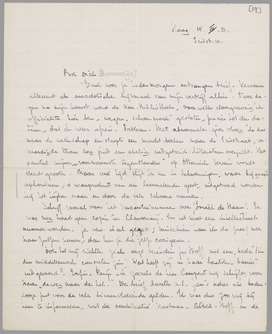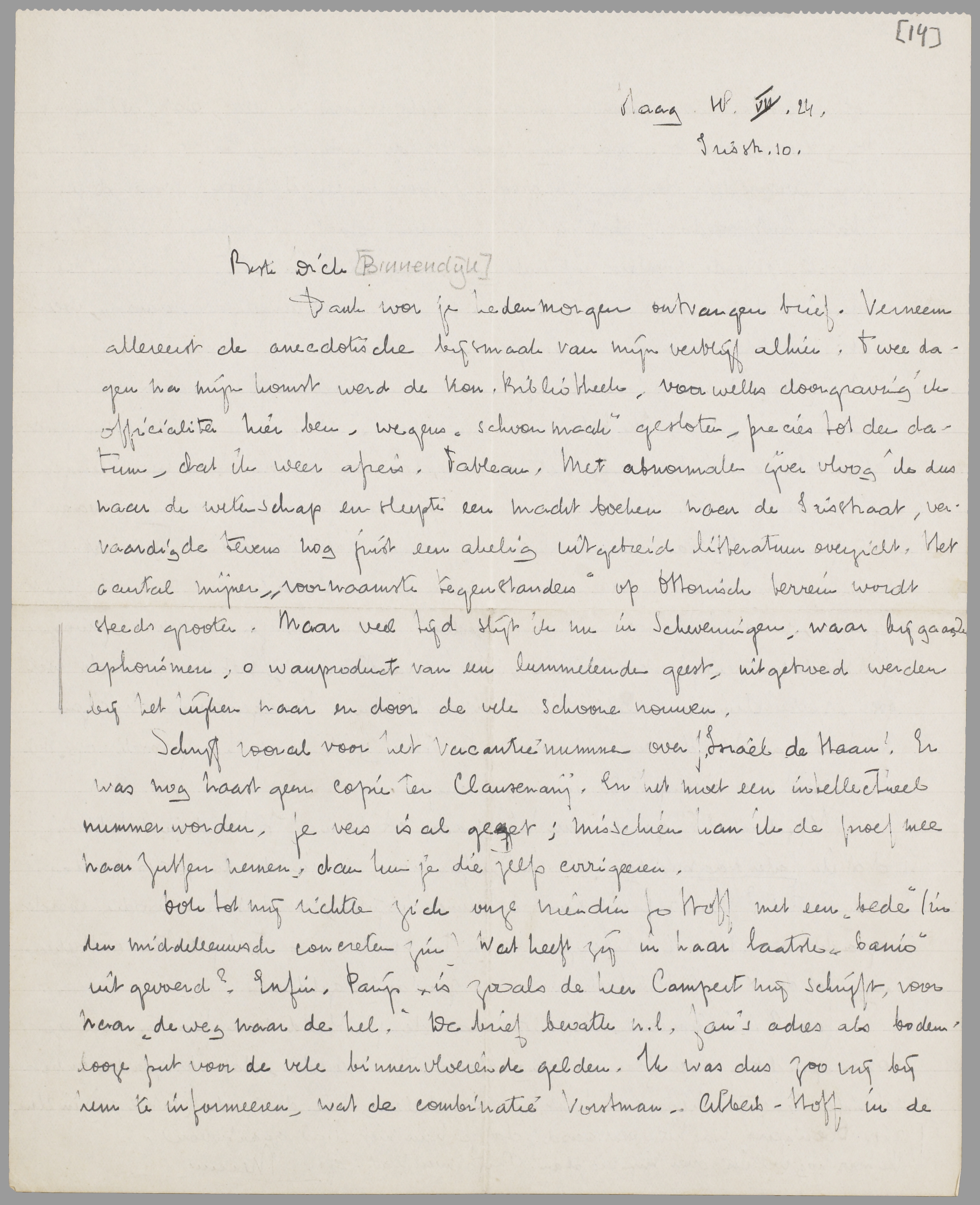 Dank voor je hedenmorgen ontvangen brief. Verneem allereerst de anecdotische bijsmaak van mijn verblijf alhier. Twee dagen na mijn komst werd de Kon. Bibliotheek, voor welks doorgraving ik officialiter hier ben, wegens ‘schoonmaak’ gesloten, precies tot den datum, dat ik weer afreis. Tableau. Met abnormalen ijver vloog ik dus naar de wetenschap en sleepte een macht boeken naar de Irisstraat, vervaardigde tevens nog juist een akelig uitgebreid litteratuur overzicht. Het aantal mijner ‘voornaamste tegenstanders’ op Ottorisch terrein wordt steeds grooter. Maar veel tijd slijt ik nu in Scheveningen, waar bijgaande aphorismen, o wanproduct van een lummelenden geest, uitgebroed werden bij het kijken naar en door de vele schoone vrouwen.