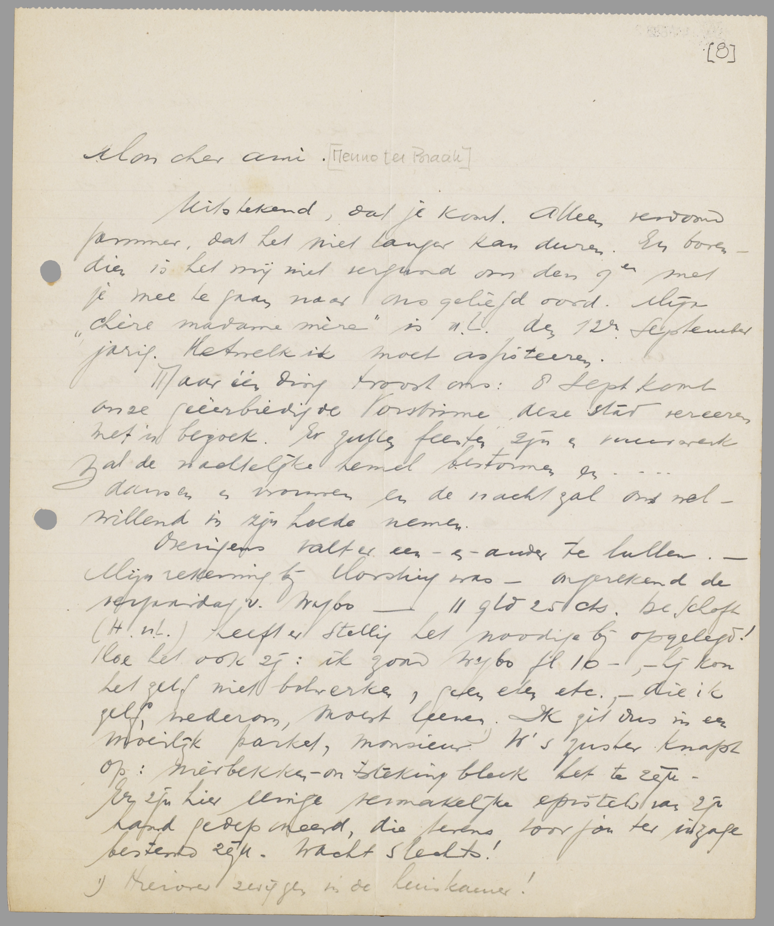 Uitstekend, dat je komt. Alleen verdomd jammer, dat het niet langer kan duren. En bovendien is het mij niet vergund om den 9en met je mee te gaan naar ons geliefd oord. Mijn ‘chère madame mère’ is n.l. den 12en September jarig. Hetwelk ik moet assisteeren.
