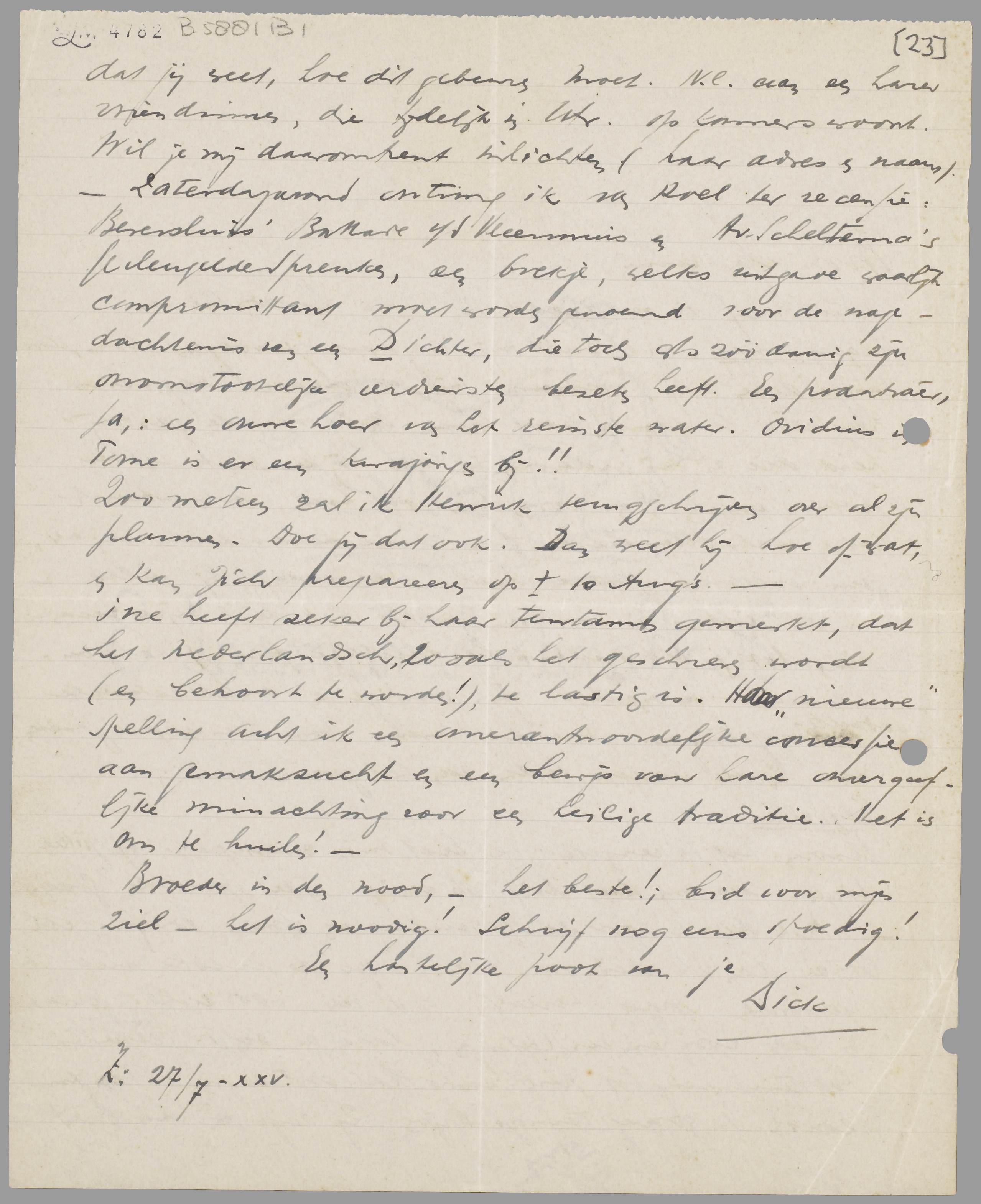 1. Allgemeines. Je zult mij 'n groot genoegen doen, door langs dezen weg, namens mij, je ouders nog eens hartelijk te danken voor hun onbegrensde gastvrijheid die zij mij wederom in zoo rijke mate hebben doen genieten; en bovendien voor hun onbaatzuchtige welwillendheid t.a.v. de behandeling mijner, nu volkomen genezen, keel. Het verblijf bij jullie - je weet dat - is voor mij altijd het deel mijner vacantie, dat (behoudens luidruchtige feesten) het aangenaamste is, o.a. door zijn rustige en intellectueele gedachte-wisselingen. Doe hun tevens mijn hartelijke groeten; hun èn de verdere leden van het gezin. -