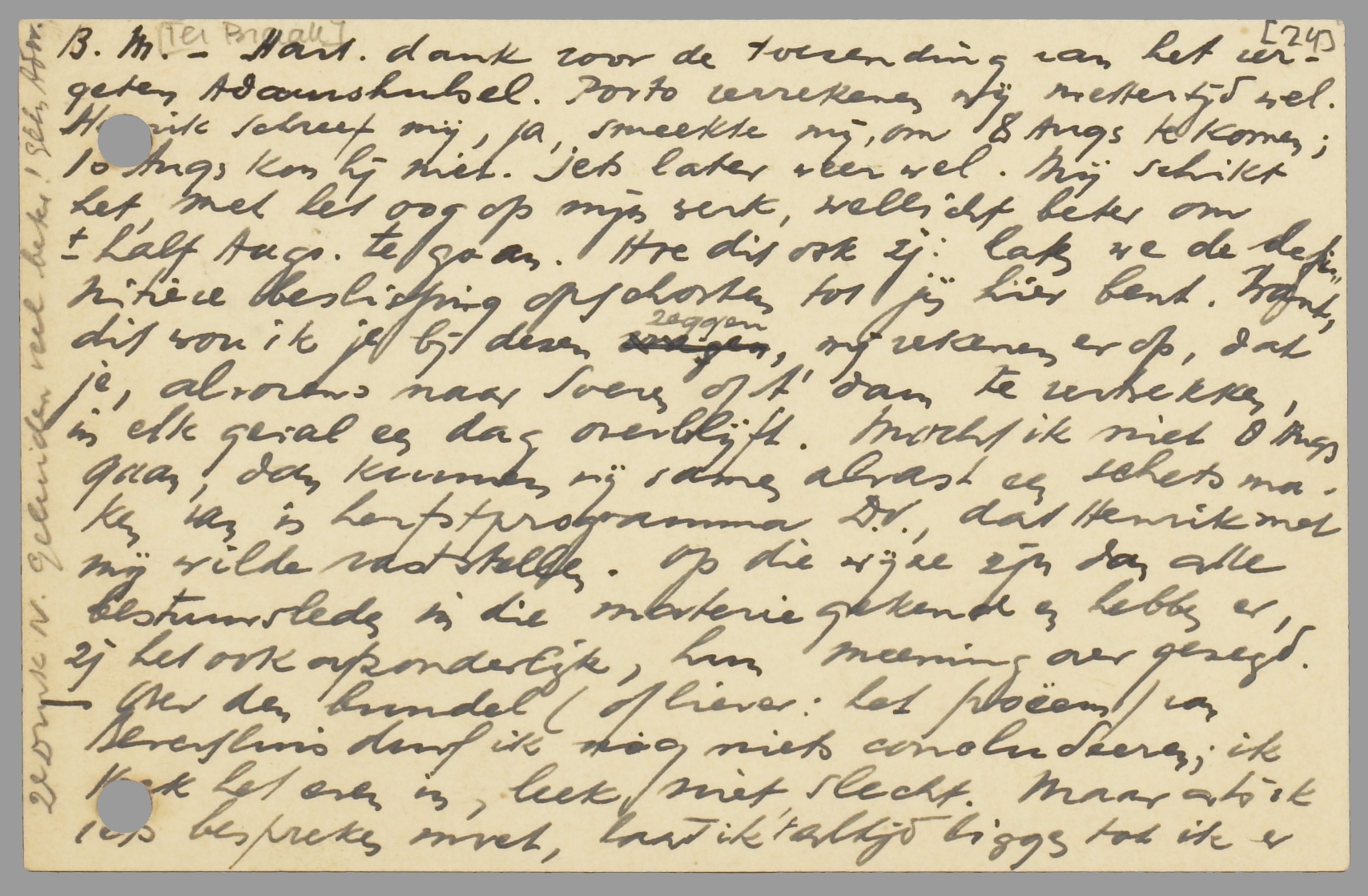 Hart. dank voor de toezending van het vergeten Adamshulsel. Porto verrekenen wij mettertijd wel. Henrik schreef mij, ja, smeekte mij, om 8 Augs te komen; 10 Augs kon hij niet. Iets later weer wel. Mij schikt het, met het oog op mijn werk, wellicht beter om half Augs te gaan. Hoe dit ook zij: laten we de definitieve beslissing opschorten tot jij hier bent. Want, dit wou ik je bij dezen zeggen, wij rekenen er op, dat je alvorens naar Soeren of A'dam te vertrekken, in elk geval een dag overblijft. Mocht ik niet 8 Augs. gaan, dan kunnen wij samen alvast een schets maken van 'n herfstprogramma D.V., dat Henrik met mij wilde vaststellen. Op die wijze zijn dan alle bestuursleden in die materie gekend en hebben er, zij het ook afzonderlijk, hun meening over gezegd. - Over den bundel (of liever: het poëem) van Beversluis durf ik nog niets concludeeren; ik keek het even in, leek niet slecht. Maar als ik iets bespreken moet, laat ik 't altijd liggen tot ik er meteen over schrijf. - Van Wybo ontving ik een lijstje van S.L.-lezingen, waarop ook de Graaf en Jordaan prijken. Jan zit in Brussel, interviewde Teirlinck en v/d Woestijne. Hij logeert er bij 'n vriend!?? Enny de Gr. nog steeds niet in A'dam verschenen, schreef Henny! - Je schrijft wel, wanneer je komt.