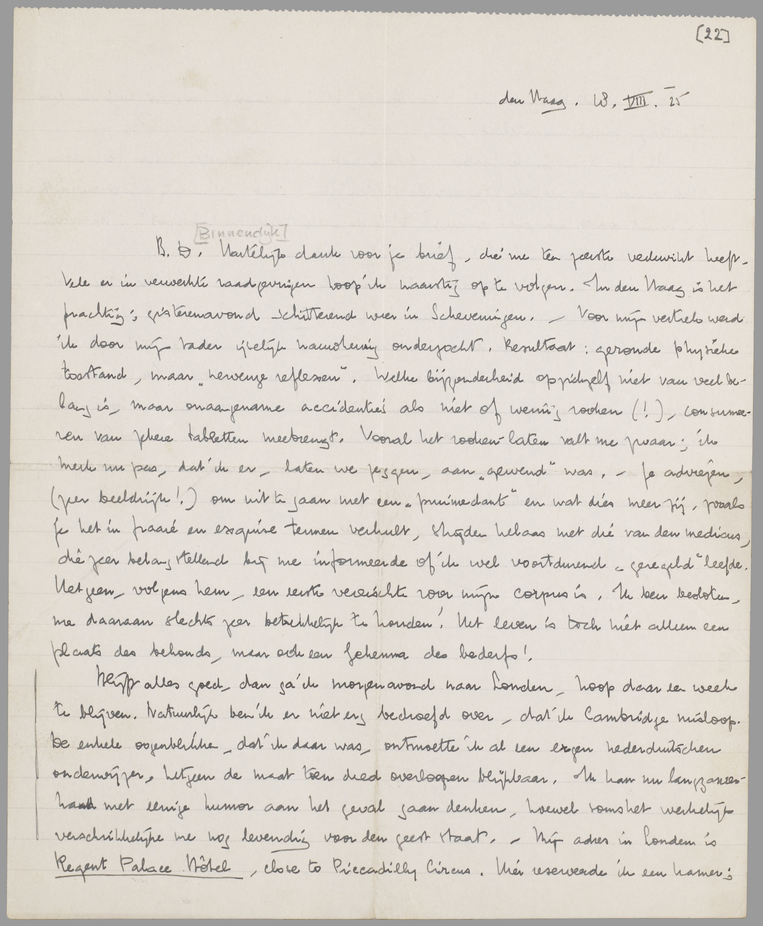 Blijft alles goed, dan ga ik morgenavond naar Londen, hoop daar een week te blijven. Natuurlijk ben ik er niet erg bedroefd over, dat ik Cambridge misloop. De enkele oogenblikken, dat ik daar was, ontmoette ik al een ergen nederduitschen onderwijzer, hetgeen de maat toen deed overloopen blijkbaar. Ik kan nu langzamerhand met eenige humor aan het geval gaan denken, hoewel soms het werkelijk verschrikkelijke me nog levendig voor den geest staat. - Mijn adres in Londen is Regent Palace Hôtel, close to Piccadilly Circus. Hier reserveerde ik een kamer; als ik er plaats krijg en als ‘t me bevalt, blijf ik daar. In geen geval een Christelijk jonchelingentehuis! -