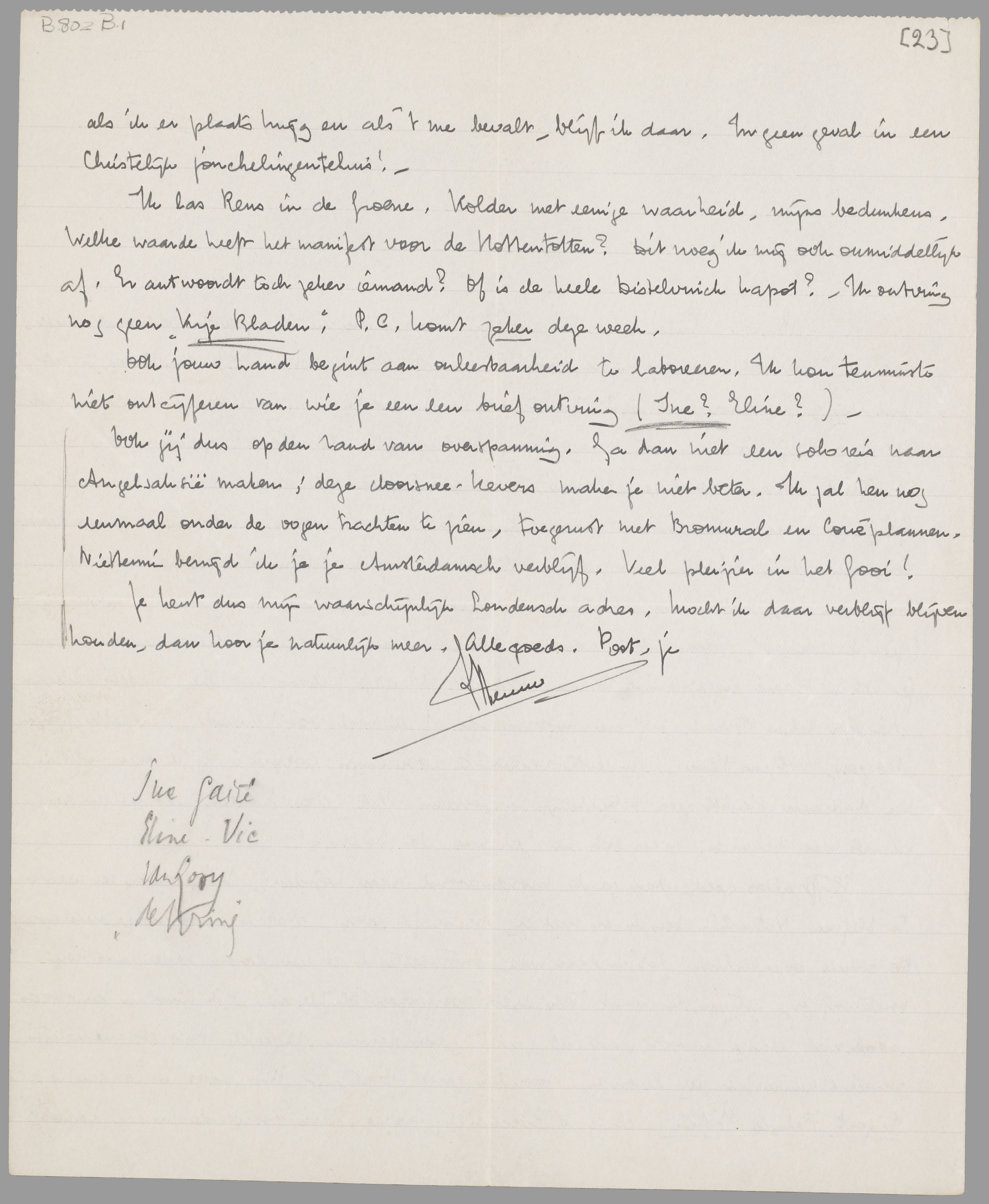 Ook jouw hand begint aan onleesbaarheid te laboreeren. Ik kon tenminste niet ontcijferen van wie je een brief ontving (Ine? Eline?) - Ook jij dus op den rand van overspanning. Ga dan niet een soloreis naar Angelsaksië maken; deze doorsnee-kevers maken je niet beter. Ik zal hen nog eenmaal onder de oogen trachten te zien, toegerust met Bromural en Corieplannen. Niettemin benijd ik je je Amsterdamsch verblijf. Veel plezier in het Gooi!