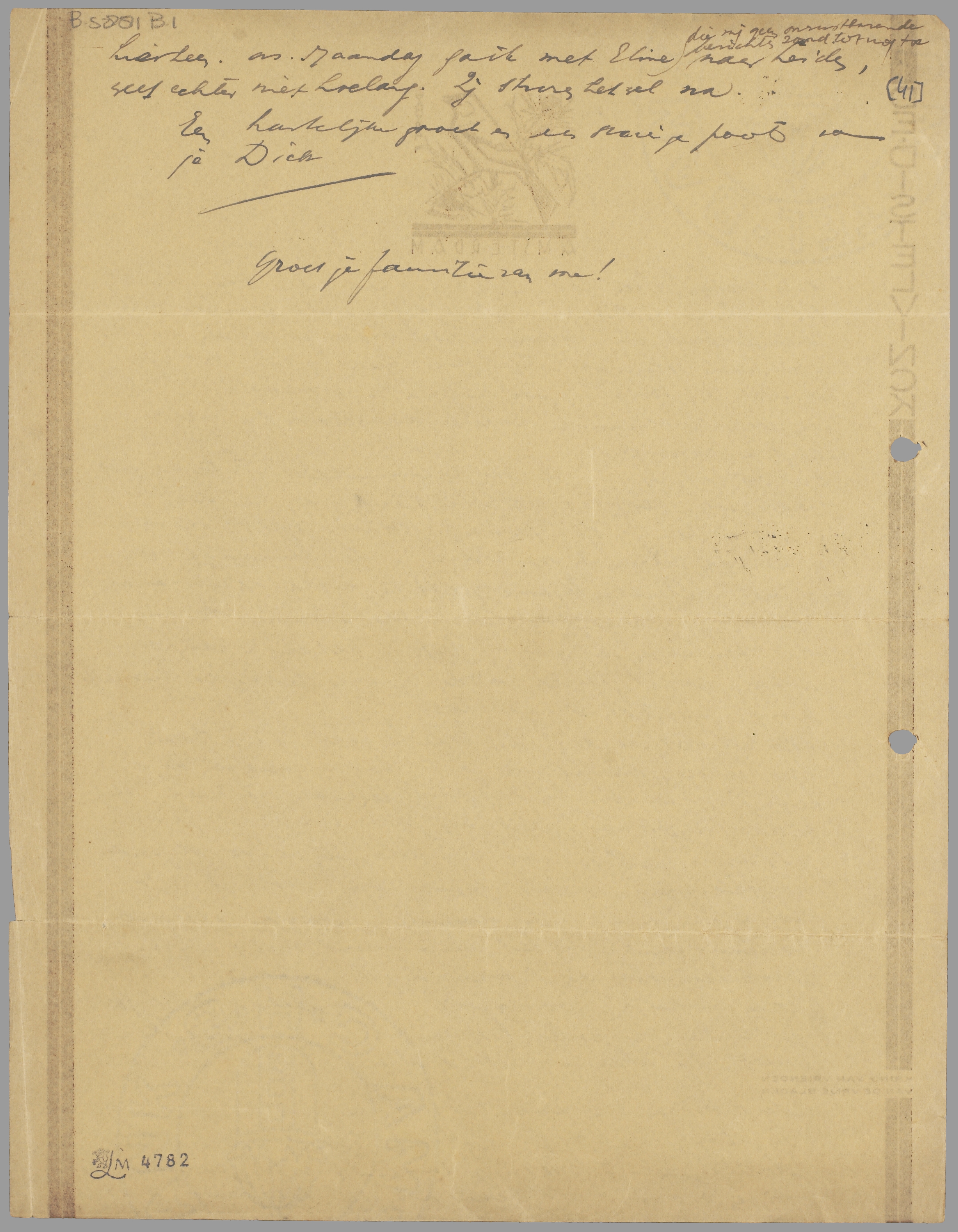 Ik stop, want ben erg moe van 't werken en drinken erna. Hou je taai. Ik ben in gedachten bij je en bid voor je. Stuur post tot Woensdag maar hierheen. As. Maandag ga ik met Eline, die mij geen onrustbarende berichten zond tot nog toe, naar Leiden, weet echter niet hoelang. Zij sturen het wel na.