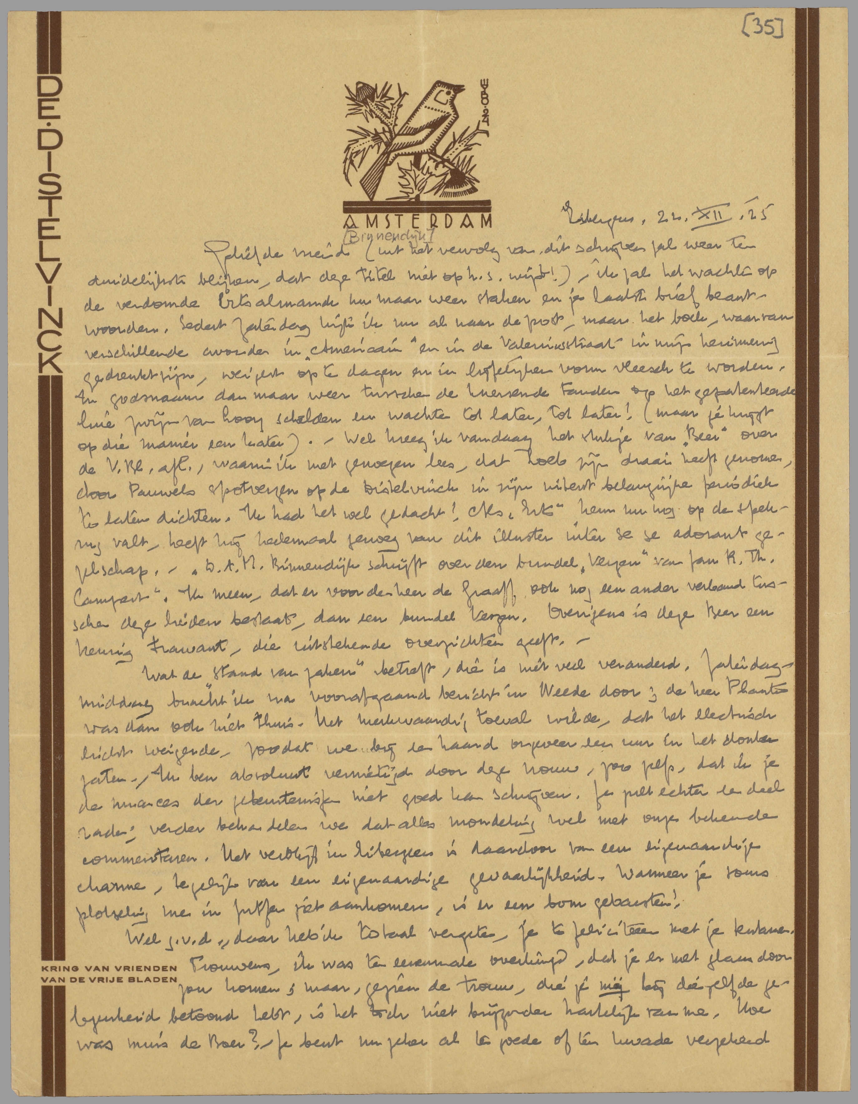 (uit het vervolg van dit schrijven zal weer ten duidelijkste blijken, dat deze titel niet op h.s. wijst!), ik zal het wachten op de verdomde Ertsalmanak nu maar weer staken en je laatste brief beantwoorden. Sedert Zaterdag kijk ik nu al naar de post, maar het boek, waarvan verschillende avonden in ‘Americain’ en in de Valeriusstraat in mijn herinnering gedrenkt zijn, weigert op te dagen en in lijfelijken vorm vleesch te worden. In godsnaam dan maar weer tusschen de knersende tanden op het gepatenteerde luie zwijn van Looy schelden en wachten tot later, tot later! (maar je krijgt op die manier een kater). - Wel kreeg ik vandaag het stukje van ‘Beer’ over de V.Bl. afl., waarin ik met genoegen lees, dat Loeb zijn draai heeft genomen, door Pauwels spotverzen op de Distelvinck in zijn uiterst belangrijke periodiek te laten dichten. Ik had het wel gedacht! Als ‘Erts’ hem nu nog op de spekrug valt, heeft hij helemaal genoeg van dit illuster inter se se adorant gezelschap. - ‘D.A.M. Binnendijk schrijft over den bundel “Verzen” van Jan R.Th. Campert’. Ik meen, dat er voor den heer de Graaff ook nog een ander verband tusschen deze lieden bestaat, dan een bundel Verzen. Overigens is deze Beer een keurig trawant, die uitstekende overzichten geeft. -