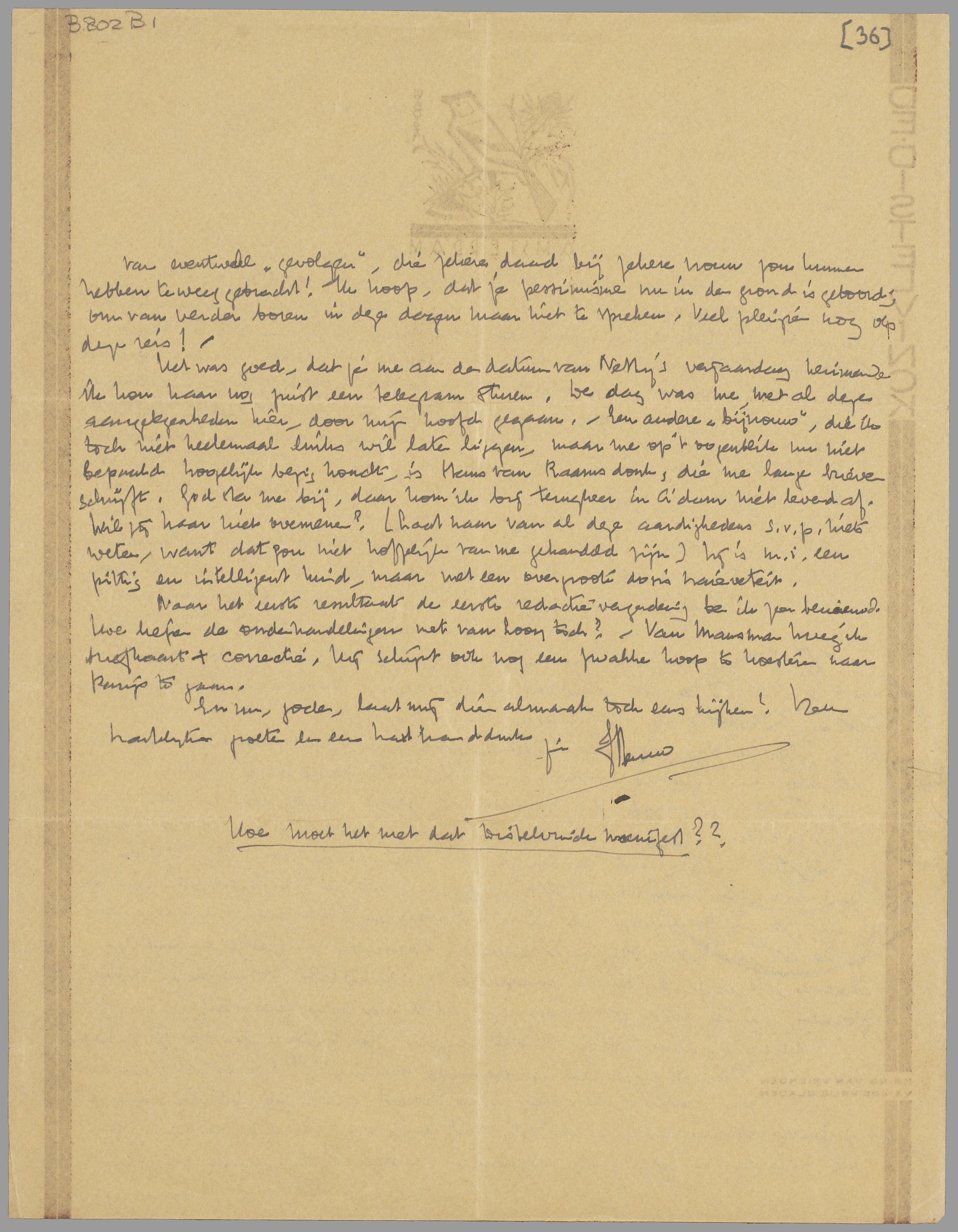 Het was goed, dat je me aan den datum van Netty’s verjaardag herinnerde, ik kon haar nog juist een telegram sturen. De dag was me, met al deze aangelegenheden hier, door mijn hoofd gegaan. - Een andere ‘bijvrouw’, die ik toch niet heelemaal links wil laten liggen, maar me op ’t oogenblik nu niet bepaald hoogelijk bezig houdt, is Hans van Raamsdonk, die me lange brieven schrijft. God sta me bij, daar kom ik bij terugkeer in A’dam niet levend af. Wil jij haar niet overnemen? (Laat haar van al deze aardigheden s.v.p. niets weten, want dat zou niet hoffelijk van me gehandeld zijn). Zij is m.i. een pittig en intelligent kind, maar met een overgroote dosis naieveteit.