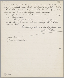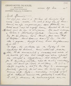 De dagen, die verloopen zijn van Vrijdag 18 tot Donderdag 24 behooren, naar je wellicht geraden hebt, tot de vermoeiendste en onzedelijkste welke ik den laatsten tijd (die toch waarlijk niet arm is geweest aan overspel en alcoholisme) heb beleefd. Het zou te lang duren om dit alles, naar de mate en waardering waar het recht op heeft, te schilderen. Ik zit er leelijk tusschen en heb mij in den Haag in ‘amoureuze perikelen’ gestoken, die wel eens zeer lastig voor mij kunnen worden. Enfin - mondeling wisselen wij wel op de befaamde manier van gedachten = avonturen. Ik stel je daarom ten nadrukkelijkste voor, om deze week een of 2 dagen bij ons te komen. Je zult er mij een groot plezier mee doen, al begrijp ik dat ‘beteren’ je in het achterland gevangen zullen houden en dat je noode de streek der liefde zult verlaten.