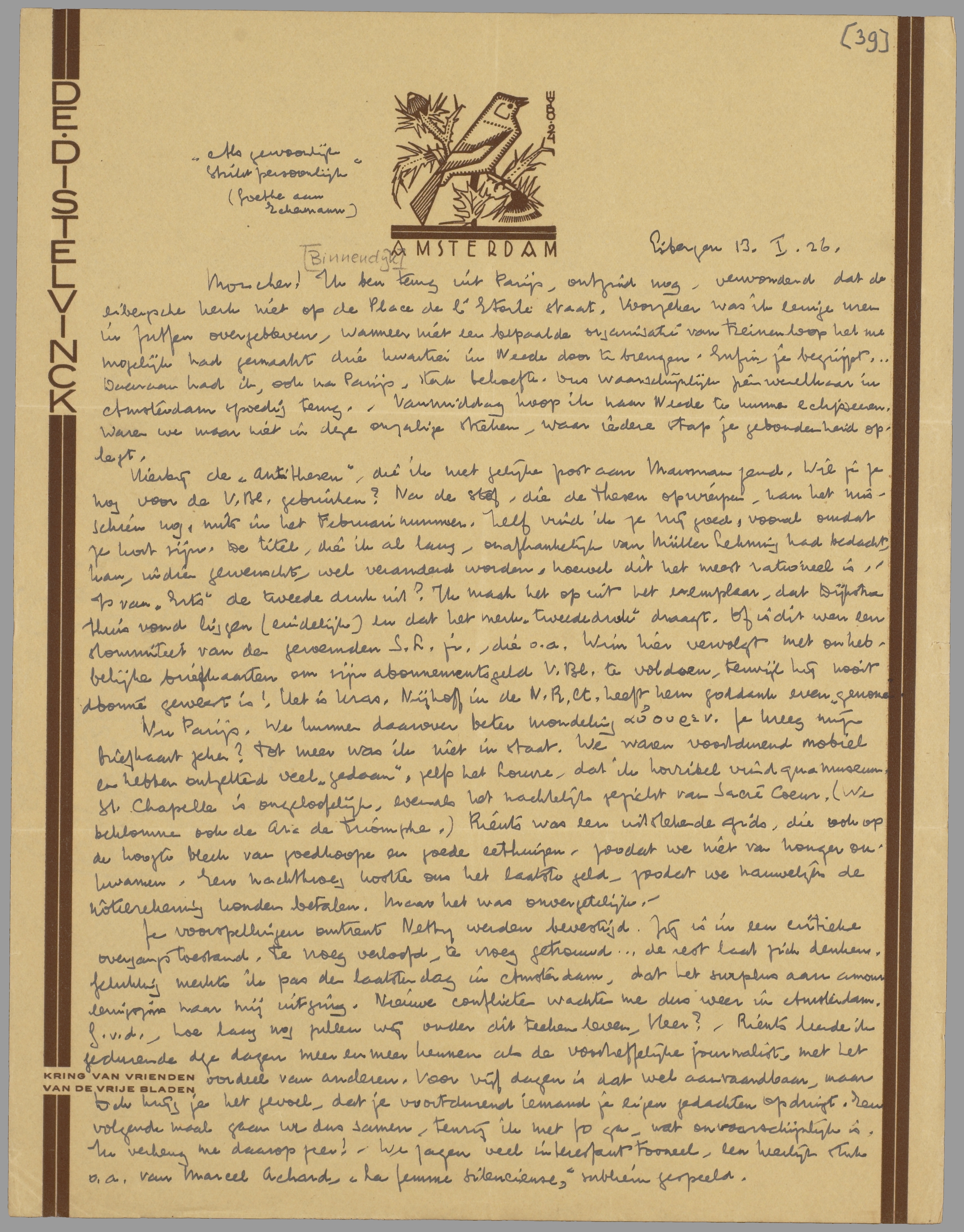 Hierbij de ‘Antithesen’, die ik met gelijke post aan Marsman zend. Wil je ze nog voor de V.Bl. gebruiken? Na de stof, die de thesen opwierpen, kan het misschien nog, mits in het Februarinummer. Zelf vind ik ze vrij goed, vooral omdat ze kort zijn. De titel, die ik al lang, onafhankelijk van Müller Lehning had bedacht, kan, indien gewenscht, wel veranderd worden, hoewel dit het meest rationeel is. Is van ‘Erts’ de tweede druk uit? Ik maak het op uit het exemplaar, dat Dijkstra thuis vond liggen (eindelijk) en dat het merk ‘tweede druk’ draagt. Of is dit weer een stommiteit van den genoemden S.L. jr., die o.a. Wim hier vervolgt met onhebbelijke briefkaarten om zijn abonnementsgeld V.Bl. te voldoen, terwijl hij nooit abonné geweest is! Het is kras. Nijhoff in de N.R.Ct. heeft hem goddank even ‘genoemd’.