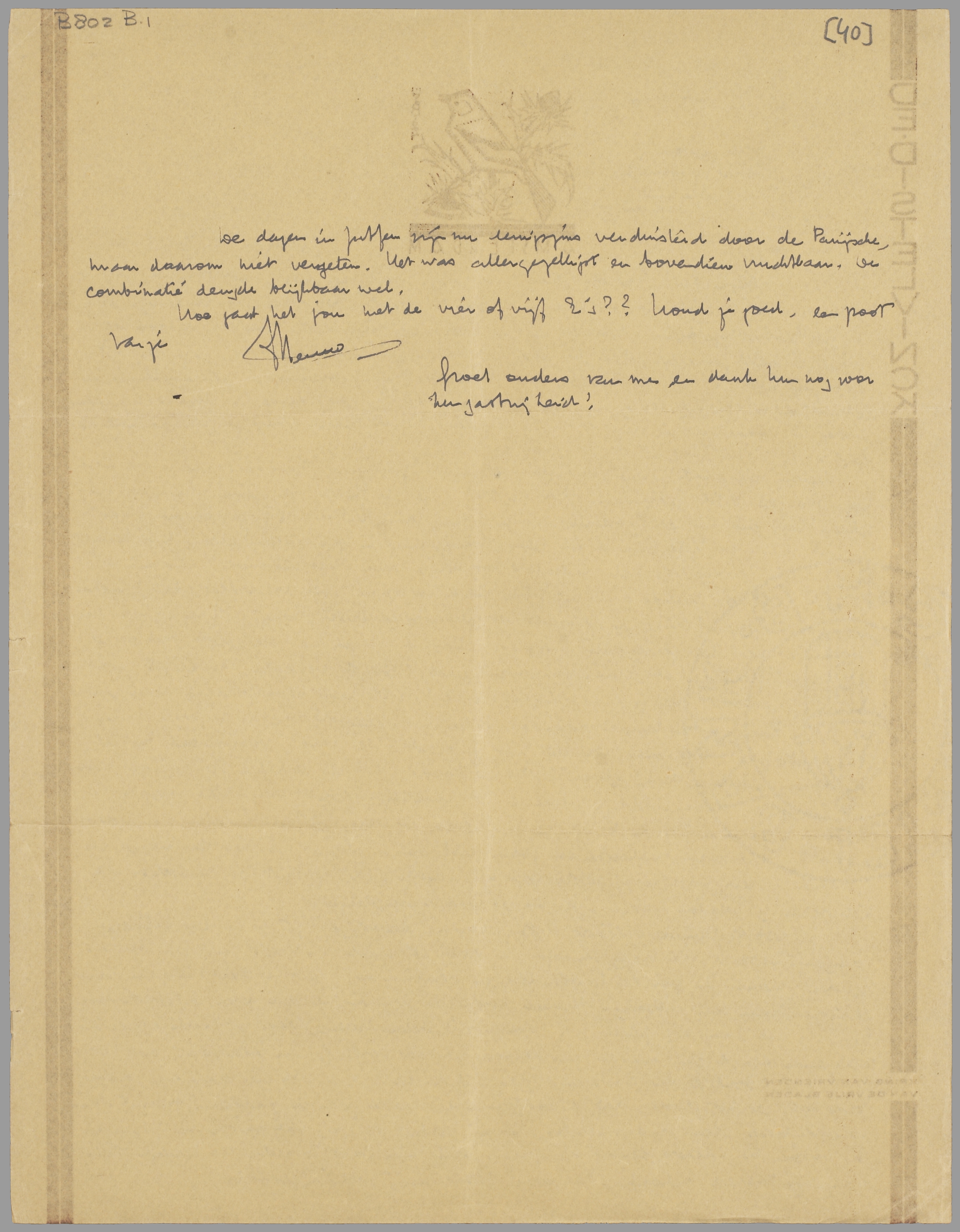 Nu Parijs. We kunnen daarover beter mondeling αὐ ουρεν. Je kreeg mijn briefkaart zeker? Tot meer was ik niet in staat. We waren voortdurend mobiel en hebben ontzettend veel ‘gedaan’, zelfs het Louvre, dat ik horribel vind qua museum. St. Chapelle is ongeloofelijk, evenals het nachtelijk gezicht van Sacré Coeur. (We beklommen ook de Arc de Triomphe.) Rients was een uitstekende gids, die ook op de hoogte bleek van goedkoope en goede eethuizen, zoodat we niet van honger omkwamen. Een nachtkroeg kostte ons het laatste geld, zoodat we nauwelijks de hôtelrekening konden betalen. Maar het was onvergetelijk. -