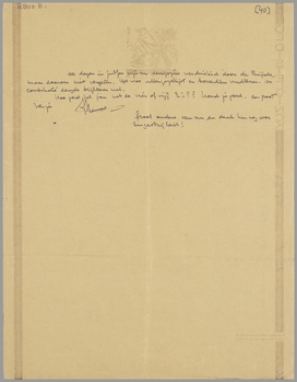 Ik ben terug uit Parijs, ontzind nog, verwonderd dat de eibergsche kerk niet op de Place de l’Etoile staat. Voorzeker was ik eenige uren in Zutfen overgebleven, wanneer niet een bepaalde organisatie van treinenloop het me mogelijk had gemaakt drie kwartier in Neede door te brengen. Enfin, je begrijpt... Daaraan had ik, ook na Parijs, sterk behoefte. Dus waarschijnlijk zien we elkaar in Amsterdam spoedig terug. - Vanmiddag hoop ik naar Neede te kunnen eclipseeren. Waren we maar niet in deze onzalige streken, waar iedere stap je gebondenheid oplegt.