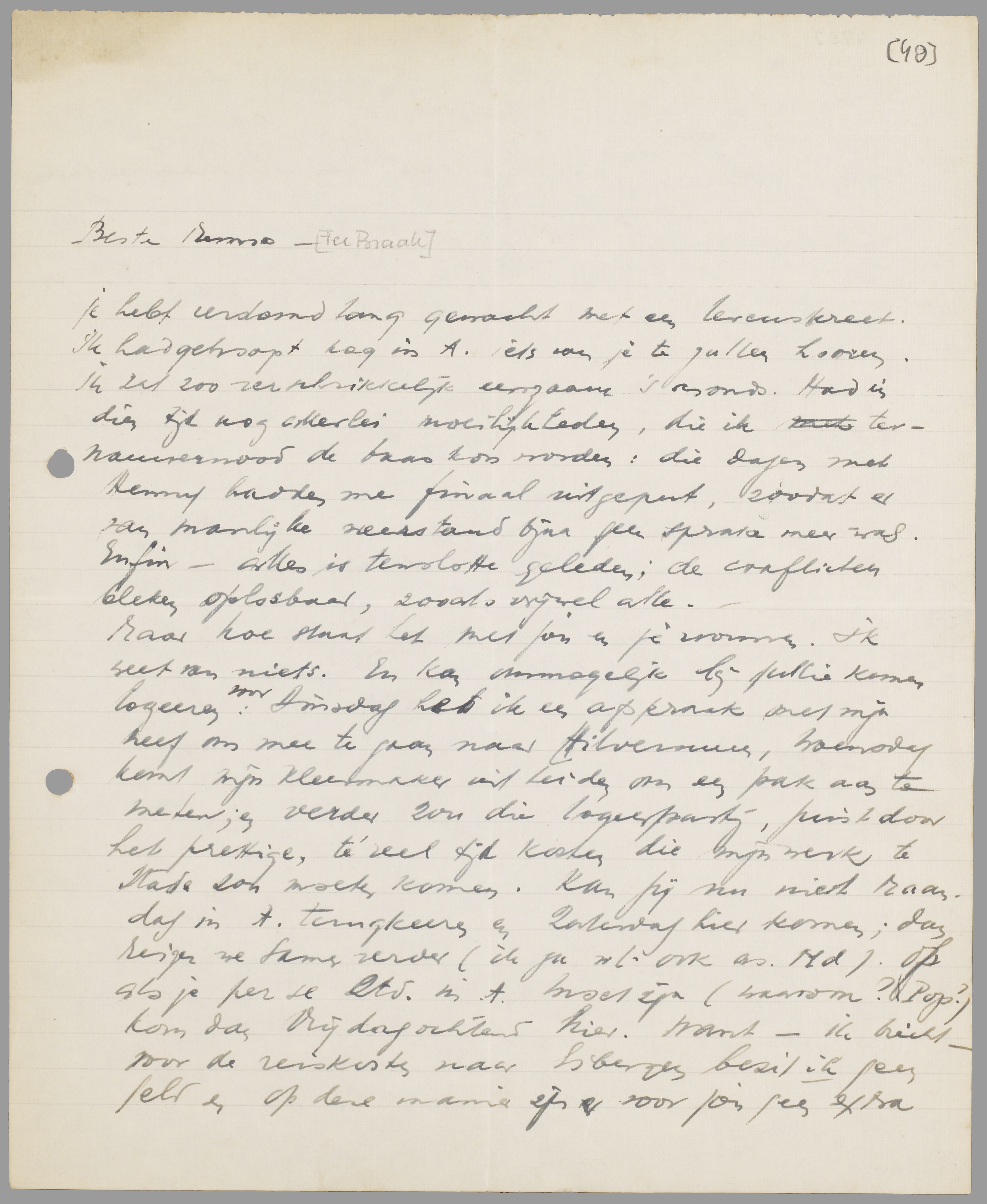 Je hebt verdomd lang gewacht met een levenskreet. Ik had gehoopt nog in A. iets van je te zullen hooren. Ik zat zoo verschrikkelijk eenzaam 's avonds. Had in dien tijd nog allerlei moeilijkheden, die ik ternauwernood de baas kon worden: die dagen met Henny hadden me finaal uitgeput, zoodat er van manlijke weerstand bijna geen sprake meer was.. Enfin - alles is tenslotte geleden; de conflicten bleken oplosbaar, zooals vrijwel alle.