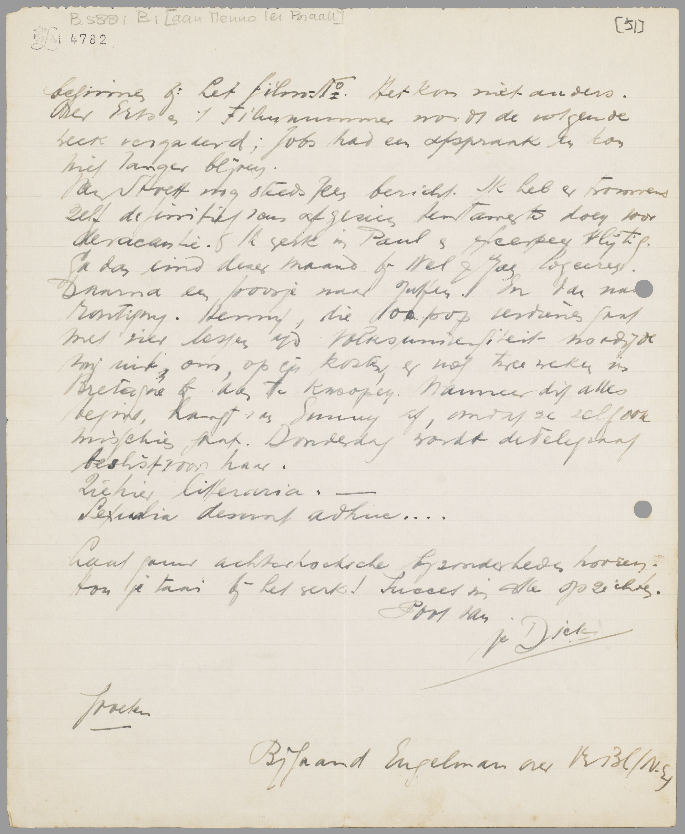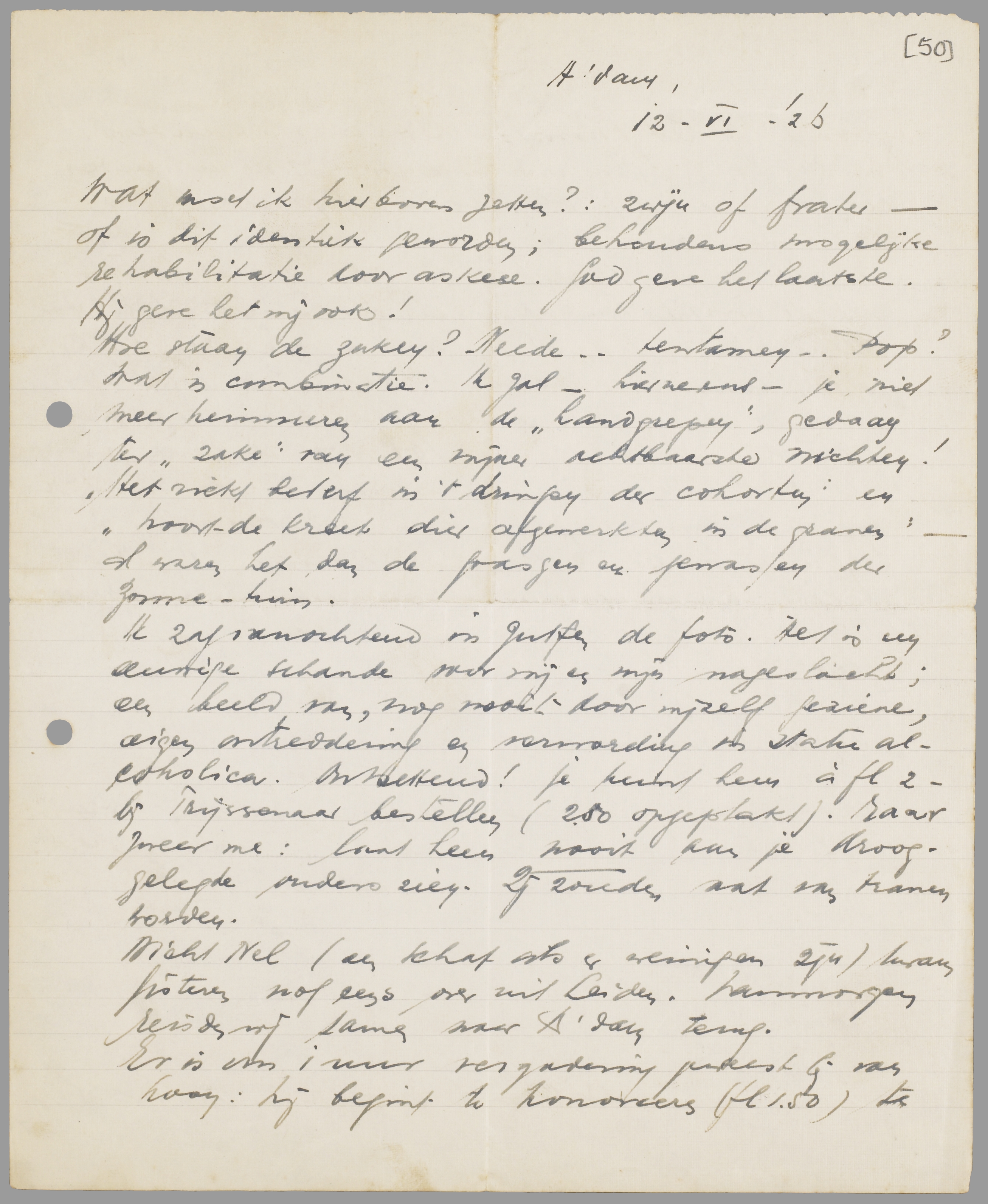 Van Stoett nog steeds geen bericht. Ik heb er trouwens zelf definitief vanaf gezien tentamens te doen voor de vacantie. Ik werk in Paul en excerpeer vlijtig. Ga dan eind dezer maand bij Nel en Jan logeeren. Daarna een poosje naar Zutfen. En dan naar Montigny. Henny, die 100 pop verdienen gaat met vier lessen v/d Volksuniversiteit noodigde mij uit om, op zijn kosten, er nog twee weken in Bretagne aan te knoopen. Wanneer dit alles begint, hangt van Emmy af, omdat ze zelf ook misschien gaat. Donderdag wordt de Telegraaf beslist voor haar.