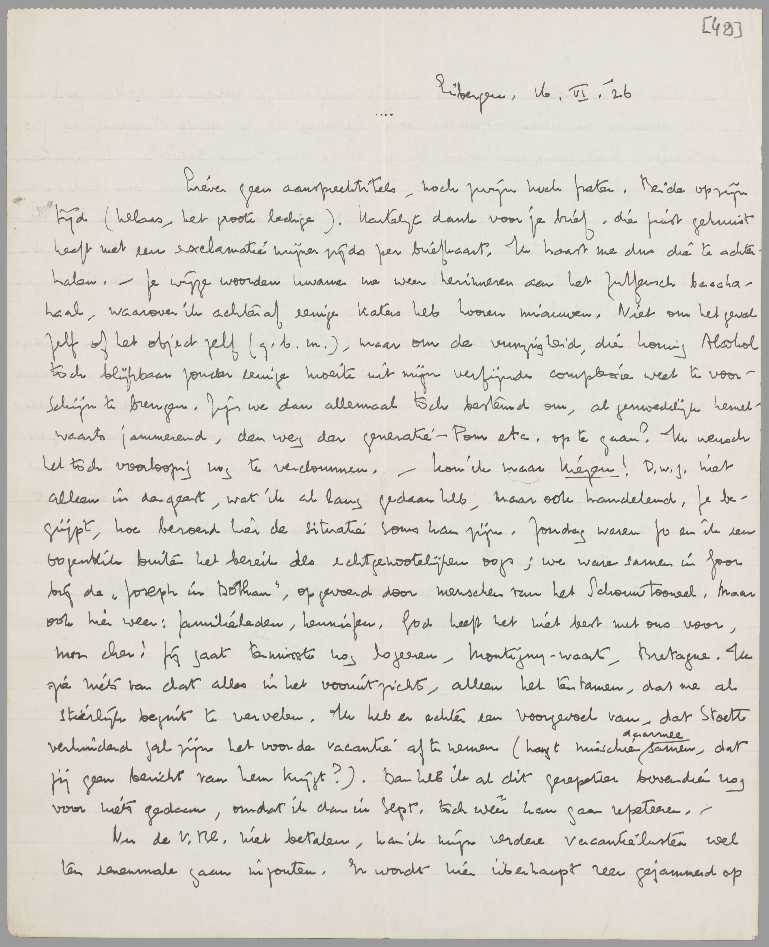 Liever geen aanspreektitels, noch zwijn noch frater. Beide op zijn tijd (helaas, het groote ledige). Hartelijke dank voor je brief, die juist gekruist heeft met een exclamatie mijnerzijds per briefkaart. Ik haast me dus die te achterhalen. - Je wijze woorden kwamen me weer herinneren aan het Zutfensch bacchanaal, waarover ik achteraf eenige katers heb hooren miauwen. Niet om het geval zelf of het object zelf (g.b.m.), maar om de vunzigheid, die koning Alcohol toch blijkbaar zonder eenige moeite uit mijn verfijnde complexie weet te voorschijn te brengen. Zijn we dan allemaal toch bestemd om, al gemoedelijk hemelwaarts jammerend, den weg der generatie-Pom etc. op te gaan? Ik wensch het toch voorloopig nog te verdommen. - Kon ik maar kiezen! D.w.z. niet alleen in den geest, wat ik al lang gedaan heb, maar ook handelend. Je begrijpt, hoe beroerd hier de situatie soms kan zijn. Zondag waren Jo en ik een oogenblik buiten het bereik des echtgenootelijken oogs; we waren samen in Goor bij de ‘Joseph in Dothan’, opgevoerd door menschen van het Schouwtooneel. Maar ook hier weer: familieleden, kennissen. God heeft het niet best met ons voor, mon cher! Jij gaat tenminste nog logeeren, Montigny-waarts, Bretagne. Ik zie niets van dat alles in het vooruitzicht, alleen het tentamen, dat me al stierlijk begint te vervelen. Ik heb er echter een voorgevoel van, dat Stoett verhinderd zal zijn het voor de vacantie af te nemen (hangt misschien daarmee samen, dat jij geen bericht van hem krijgt?). Dan heb ik al dit gerepeteer bovendien nog voor niets gedaan, omdat ik dan in Sept. toch wéér kan gaan repeteeren. -