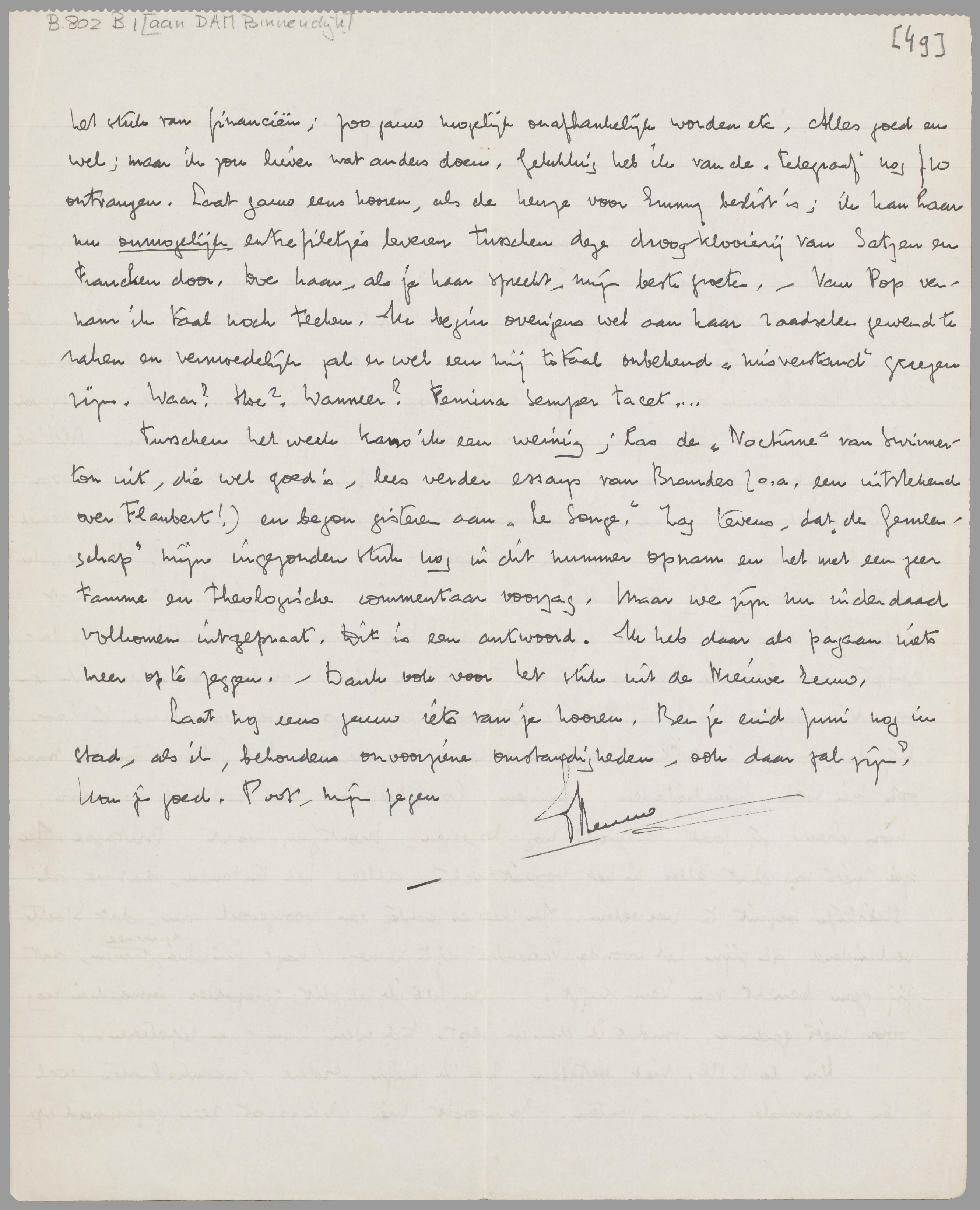 Nu de V.Bl. niet betalen, kan ik mijn verdere vacantielusten wel ten eenenmale gaan inzouten. Er wordt hier überhaupt zeer gejammerd op het stuk van financiën; zoo gauw mogelijk onafhankelijk worden etc. Alles goed en wel; maar ik zou liever wat anders doen. Gelukkig heb ik van de ‘Telegraaf’ nog ƒ 20 ontvangen. Laat gauw eens hooren, als de keuze voor Emmy beslist is; ik kan haar nu onmogelijk entrefiletjes leveren tusschen deze droogklooierij van Satzen en Francken door. Doe haar, als je haar spreekt, mijn beste groeten. - Van Pop vernam ik taal noch teeken. Ik begin overigens wel aan haar raadselen gewend te raken en vermoedelijk zal er wel een mij totaal onbekend ‘misverstand’ gerezen zijn. Waar? Hoe? Wanneer? Femina semper tacet...