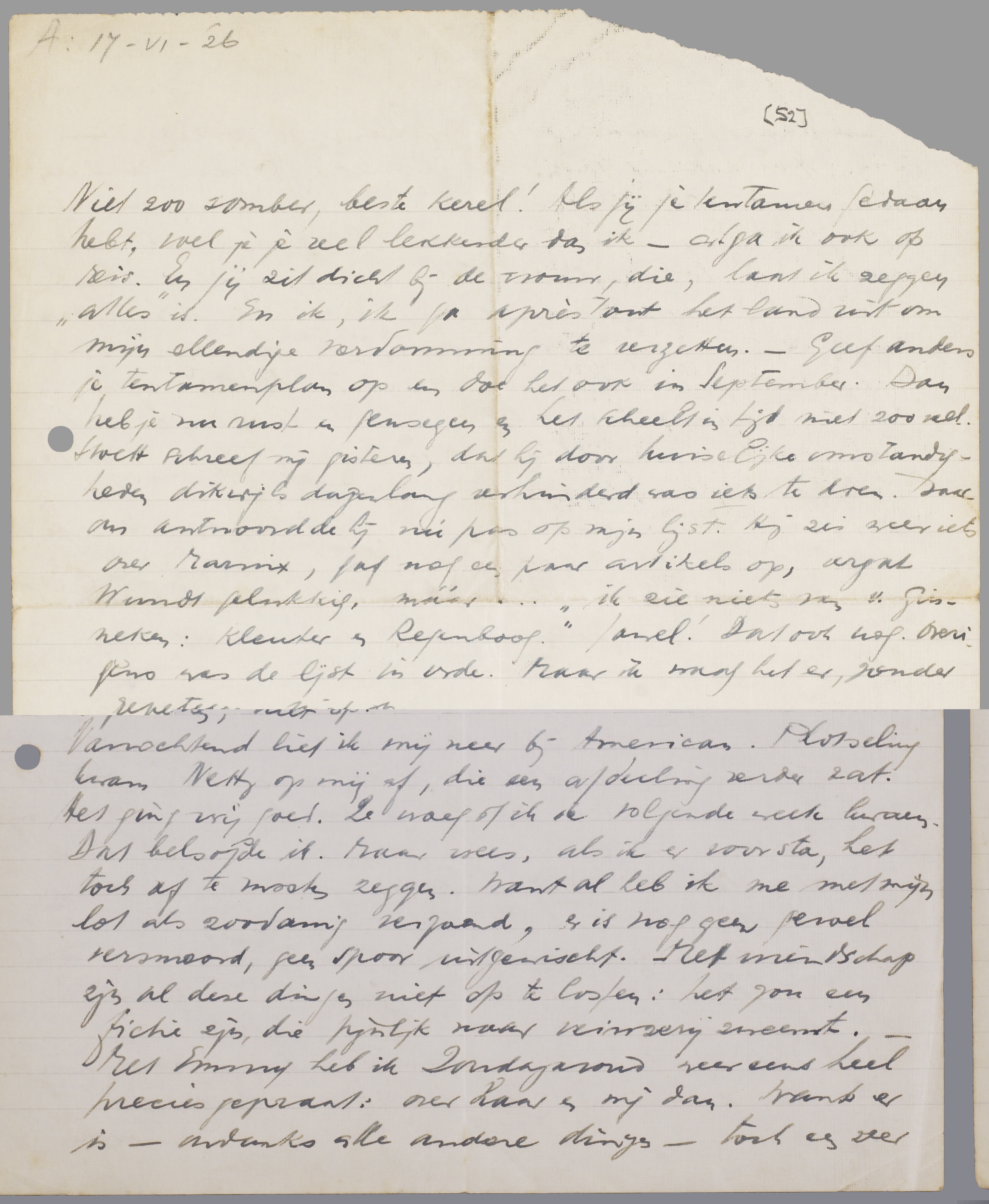 Als jij je tentamen gedaan hebt, voel je je veel lekkerder dan ik - al ga ik ook op reis. En jij zit dicht bij de vrouw, die, laat ik zeggen ‘alles’ is. En ik, ik ga après tout het land uit om mijn ellendige verdomming te verzetten. - Geef anders je tentamenplan op en doe het ook in September. Dan heb je nu rust en genoegen en het scheelt in tijd niet zoo veel. Stoett schreef mij gisteren, dat hij door huiselijke omstandigheden dikwijls dagenlang verhinderd was iets te doen. Daarom antwoordde hij nu pas op mijn lijst. Hij zei weer iets over Marnix, gaf nog een paar artikels op, vergat Wundt gelukkig, máár... ‘ik zie niets van v. Ginneken: Kleuter en Regenboog’, jawel! Dat ook nog. Overigens was de lijst in orde. Maar ik waag het er, zonder repeteeren, niet op.