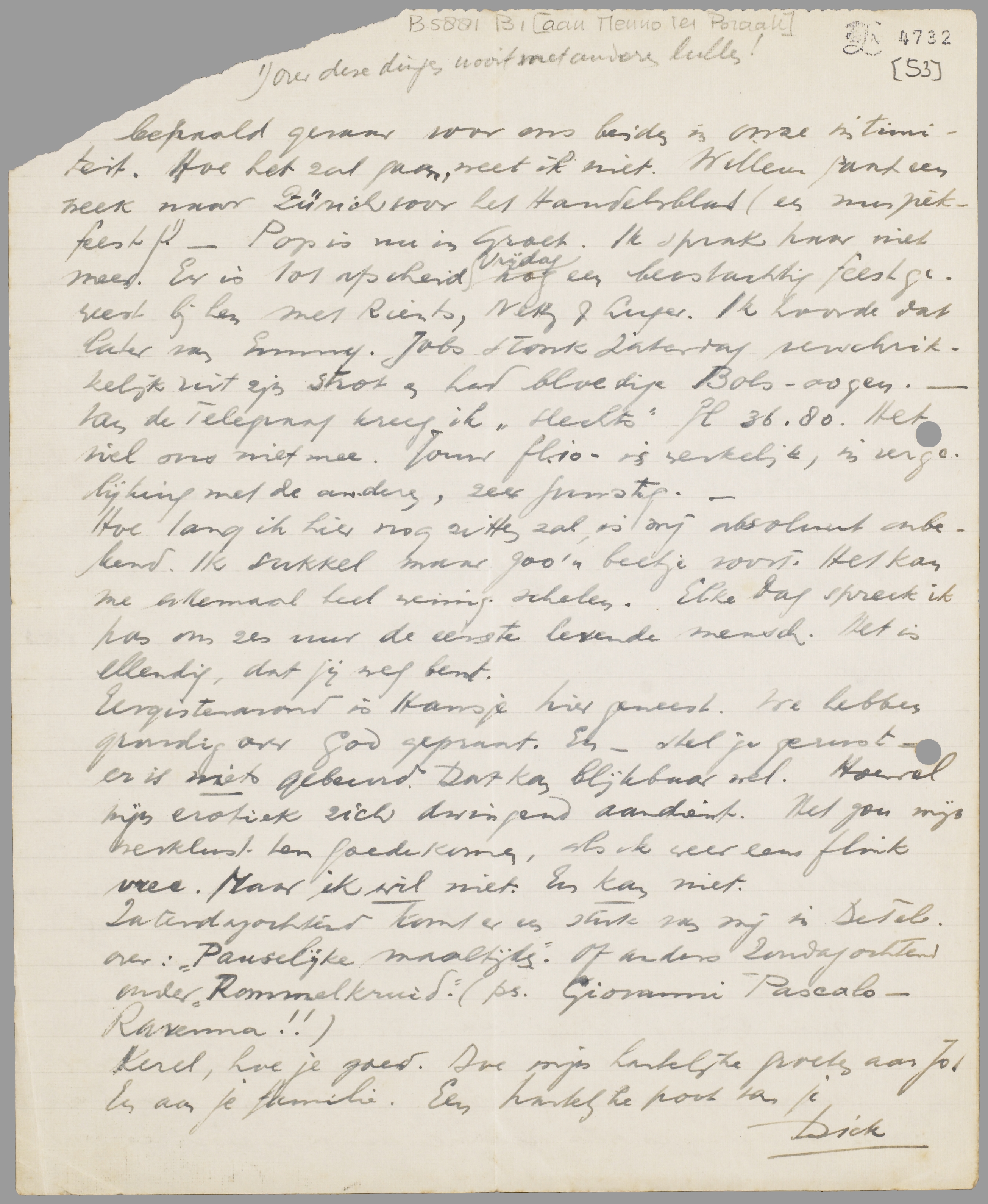 Vanochtend liet ik mij neer bij American. Plotseling kwam Netty op mij af, die een afdeeling verder zat. Het ging vrij goed. Ze vroeg of ik de volgende week kwam. Dat beloofde ik. Maar vrees, als ik er voor sta, het toch af te moeten zeggen. Want al heb ik me met mijn lot als zoodanig verzoend, er is nog geen gevoel versmoord, geen spoor uitgewischt. Met vriendschap zijn al deze dingen niet op te lossen: het zou een fictie zijn die pijnlijk naar veinzerij zweemt. - Met Emmy heb ik Zondagavond weer eens heel precies gepraat: over haar en mij dan. Want er is - ondanks alle andere dingen - toch een zeer bepaald gevaar voor ons beiden in onze intimiteit. Hoe het zal gaan, weet ik niet. Willem gaat een week naar Zürich voor het Handelsblad (een muziekfeest!) - Pop is nu in Groet. Ik sprak haar niet meer. Er is tot afscheid Vrijdag nog een beestachtig feest geweest bij hen met Rients, Netty en Luger. Ik hoorde dat later van Emmy. Jobs stonk Zaterdag verschrikkelijk uit zijn strot en had bloedige Bols-oogen. - Van de Telegraaf kreeg ik ‘slechts’ fl 36.80 - Het viel ons niet mee. Jouw fl 10 - is werkelijk, in vergelijking met de anderen, zeer gunstig.