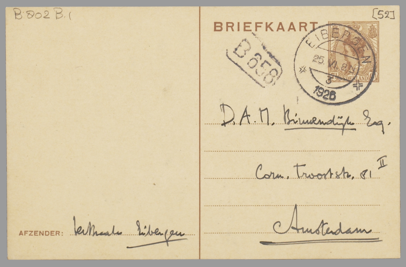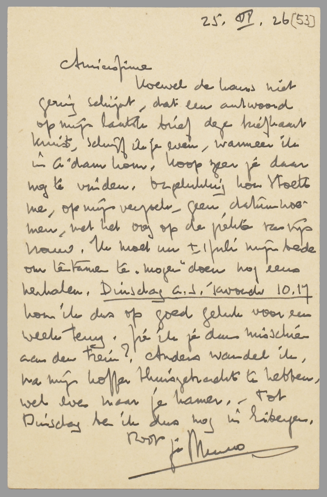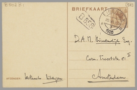 Hoewel de kans niet gering schijnt, dat een antwoord op mijn laatste brief deze briefkaart kruist, schrijf ik je even, wanneer ik in A'dam kom. Hoop zeer je daar nog te vinden. Ongelukkig kon Stoett me, op mijn verzoek, geen datum noemen, met het oog op de ziekte van zijn vrouw. Ik moet nu 1 Juli mijn bede om tentamen te ‘mogen’ doen nog eens herhalen. Dinsdag a.s. 's avonds 10.17 kom ik dus op goed geluk voor een week terug. Zie ik je dan misschien aan den trein? Anders wandel ik, na mijn koffer thuisgebracht te hebben, wel even naar je kamer. - Tot Dinsdag ben ik dus nog in Eibergen.