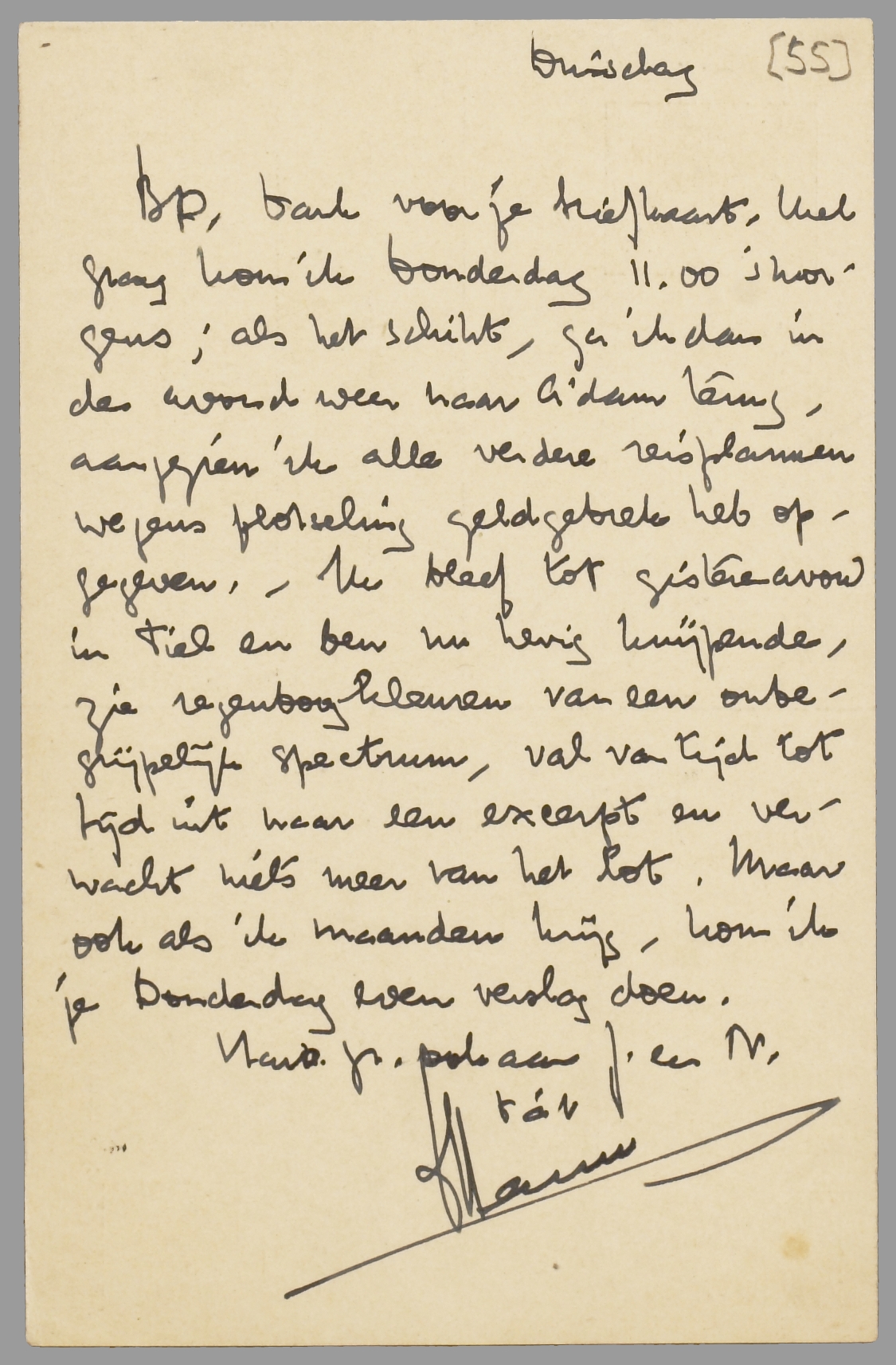 Dank voor je briefkaart. Heel graag kom ik Donderdag 11.00 uur 's morgens; als het schikt, ga ik dan in den avond weer naar A'dam terug, aangezien ik alle verdere reisplannen wegens plotseling geldgebrek heb opgegeven. - Ik bleef tot gisterenavond in Tiel en ben nu hevig knijpende, zie regenboogkleuren van een onbegrijpelijk spectrum, val van tijd tot tijd uit naar een excerpt en verwacht niets meer van het lot. Maar ook als ik maanden krijg, kom ik je Donderdag even verslag doen.