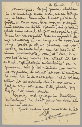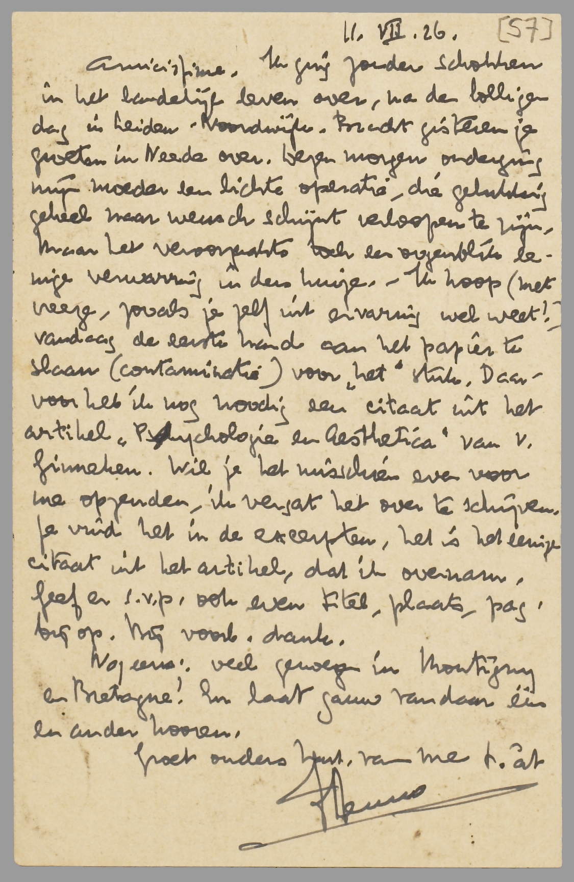 Ik ging zonder schokken in het landelijk leven over, na den lolligen dag in Leiden-Noordwijk. Bracht gisteren je groeten in Neede over. Dezen morgen onderging mijn moeder een lichte operatie, die gelukkig geheel naar wensch schijnt verloopen te zijn, maar het veroorzaakte toch een oogenblik eenige verwarring in den huize. - Ik hoop (met vreeze, zooals je zelf uit ervaring wel weet!) vandaag de eerste hand aan het papier te slaan (contaminatie) voor ‘het’ stuk. Daarvoor heb ik nog noodig een citaat uit het artikel ‘Psychologie en Aesthetica’ van v. Ginneken. Wil je het misschien even voor me opzenden, ik vergat het over te schrijven. Je vind het in de excerpten, het is het eenige citaat uit het artikel, dat ik overnam. Geef er s.v.p. ook even titel, plaats, pag. bij op. Bij voorb. dank.