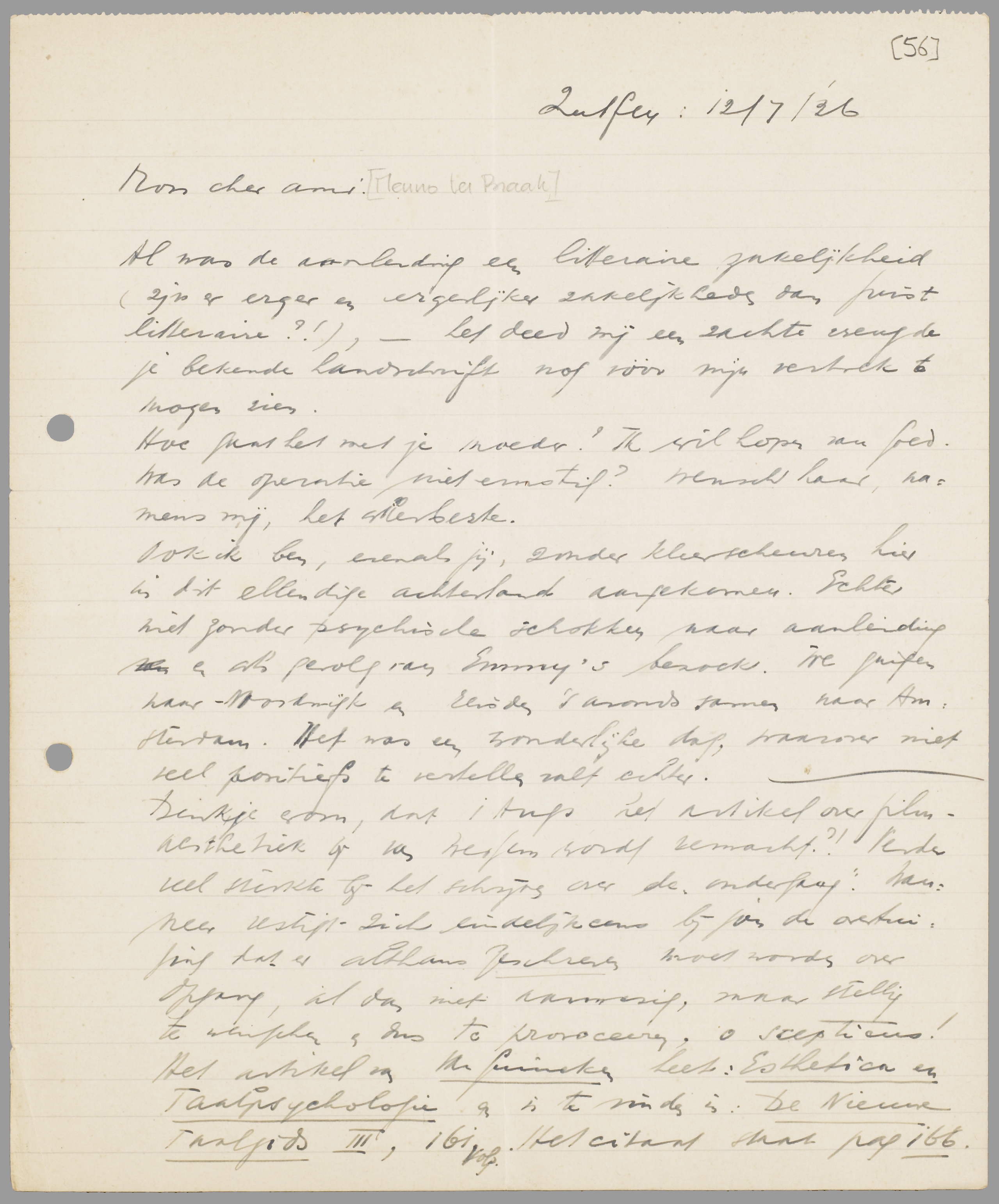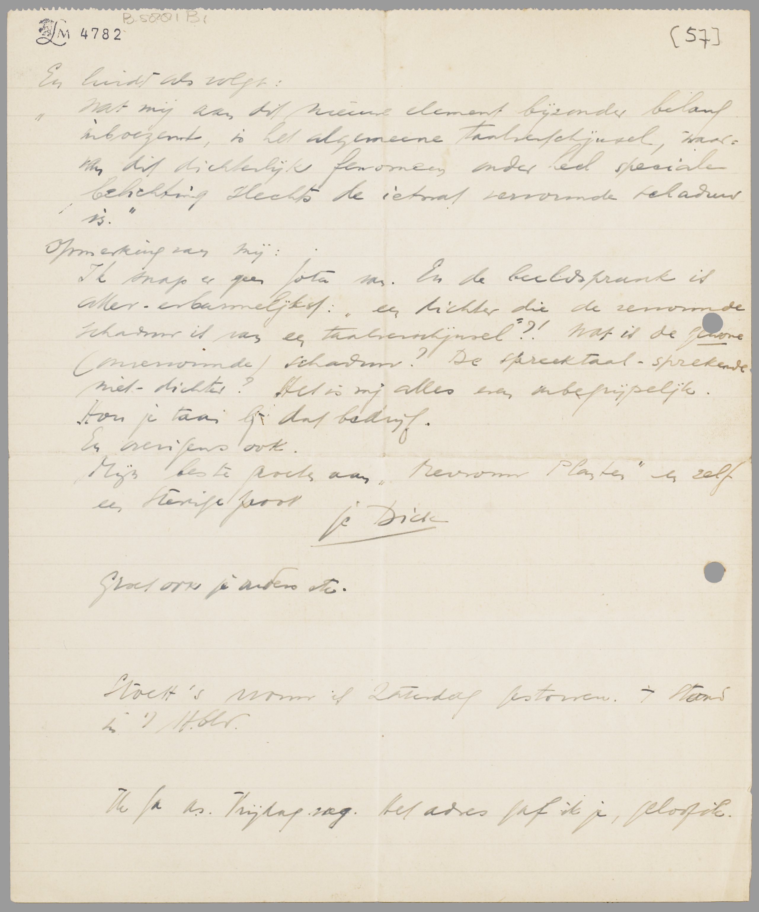 Denk je erom, dat: Augs. het artikel over filmaesthetiek bij van Wessem wordt verwacht?! Verder veel sterkte bij het schrijven over den ‘ondergang’. Wanneer vestigt zich eindelijk eens bij jou de overtuiging dat er althans geschreven moet worden over Opgang, al dan niet aanwezig, maar stellig te wenschen en dus te provoceeren, o scepticus! Het artikel van Van Ginneken heet: Esthetica en Taalpsychologie en is te vinden in: De Nieuwe Taalgids III, 161 volg. Het citaat staat pag 166. En luidt als volgt: