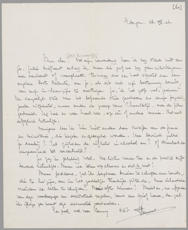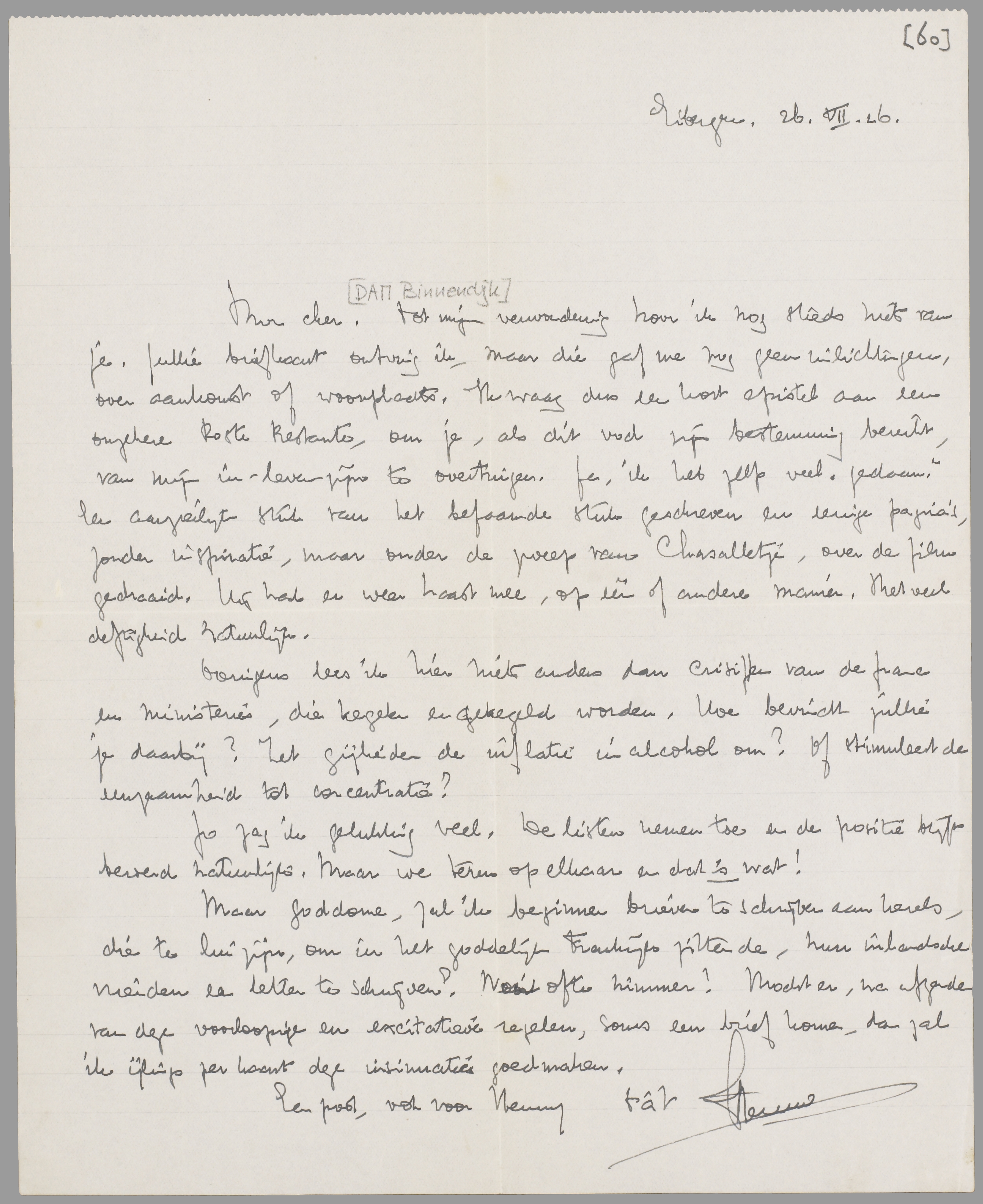 Tot mijn verwondering hoor ik nog steeds niets van je. Jullie briefkaart ontving ik, maar die gaf me nog geen inlichtingen, over aankomst of woonplaats. Ik waag dus een kort epistel aan een onzekere Poste Restante, om je, als dit vod zijn bestemming bereikt, van mijn in-leven-zijn te overtuigen. Ja, ik heb zelfs veel ‘gedaan’. Een aanzienlijk stuk van het befaamde stuk geschreven en eenige pagina’s, zonder inspiratie, maar onder de zweep van Chasalletje, over de film gedraaid. Hij had er weer haast mee, op één of andere manier. Met veel deftigheid natuurlijk.